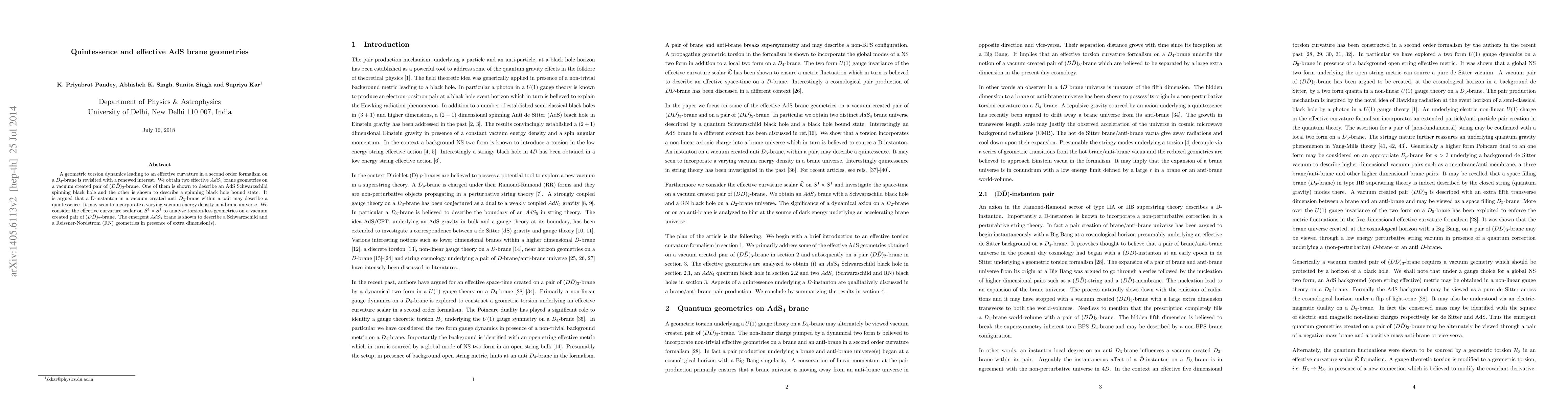 A geometric torsion dynamics leading to an effective curvature in a second order formalism on a D4-brane is revisited with a renewed interest. We obtain two effective $AdS_4$ brane geometries on a vacuum created pair of $(D{\bar D})_3$-brane. One of them is shown to describe an AdS Schwarzschild spinning black hole and the other is shown to describe a spinning black hole bound state. It is argued that a D-instanton in a vacuum created anti D3-brane within a pair may describe a quintessence. It may seen to incorporate a varying vacuum energy density in a brane universe. We consider the effective curvature scalar on $S^1\times S^1$ to analyze torsion-less geometries on a vacuum created pair of $(D{\bar D})_2$-brane. The emergent $AdS_3$ brane is shown to describe a Schwarzschild and a Reissner-Nordstrom (RN) geometries in presence of extra dimension(s).