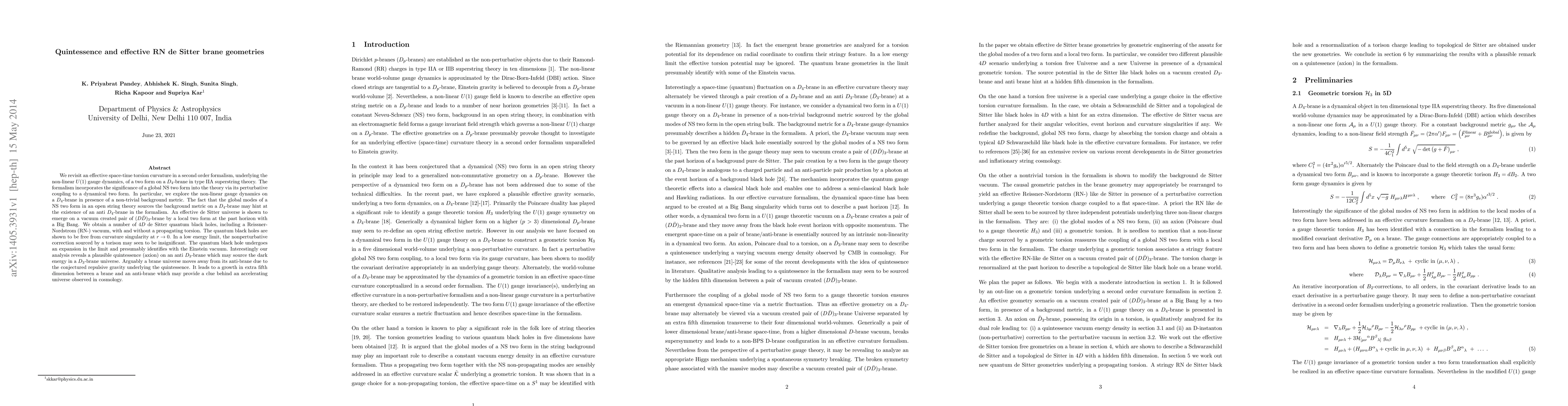 We revisit an effective space-time torsion curvature in a second order formalism, underlying the non-linear $U(1)$ gauge dynamics, of a two form on a $D_4$-brane in type IIA superstring theory. The formalism incorporates the significance of a global NS two form into the theory via its perturbative coupling to a dynamical two form. In particular, we explore the non-linear gauge dynamics on a $D_4$-brane in presence of a non-trivial background metric. The fact that the global modes of a NS two form in an open string theory sources the background metric on a $D_4$-brane may hint at the existence of an anti $D_4$-brane in the formalism. An effective de Sitter universe is shown to emerge on a vacuum created pair of $(D{\bar D})_3$-brane by a local two form at the past horizon with a Big Bang. We obtain a number of 4D de Sitter quantum black holes, including a Reissner-Nordstrom vacuum, with and without a propagating torsion. The quantum black holes are shown to be free from curvature singularity at $r\rightarrow 0$. In a low energy limit, the nonperturbative correction sourced by a torison may seen to be insignificant. The quantum black hole undergoes an expansion in the limit and presumably identifies with the Einstein vacuum. Interestingly our analysis reveals a plausible quintessence (axion) on an anti $D_3$-brane which may source the dark energy in a $D_3$-brane universe. Arguably a brane universe moves away from its anti-brane due to the conjectured repulsive gravity underlying the quintessence. It leads to a growth in extra fifth dimension between a brane and an anti-brane which may provide a clue behind an accelerating universe observed in cosmology.