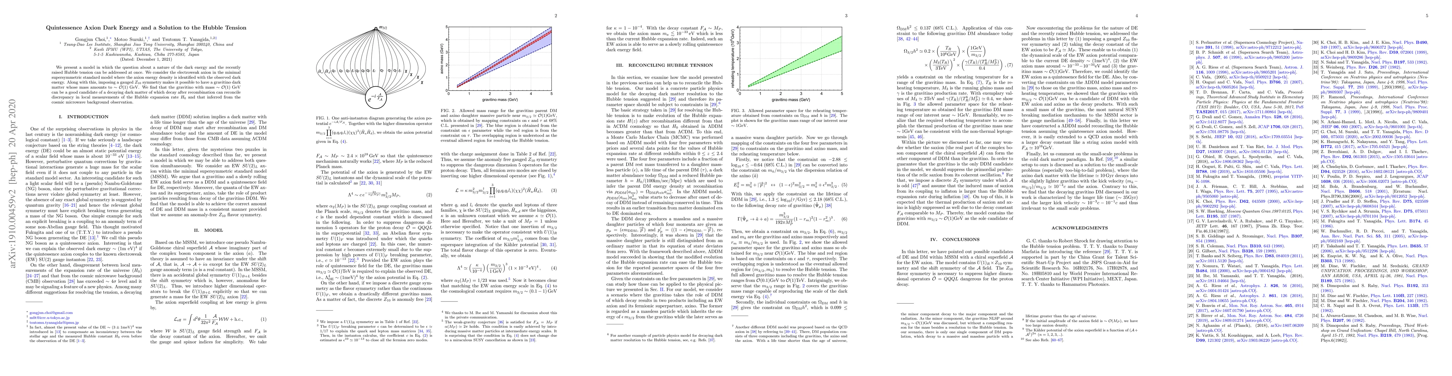 This paper proposes a model where the electroweak axion in the minimal supersymmetric standard model is identified as dark energy, addressing the Hubble tension. It suggests that a gravitino dark matter with mass around 1 GeV, produced under a gauged $Z_{10}$ symmetry, can decay post-recombination to resolve discrepancies in Hubble constant measurements.