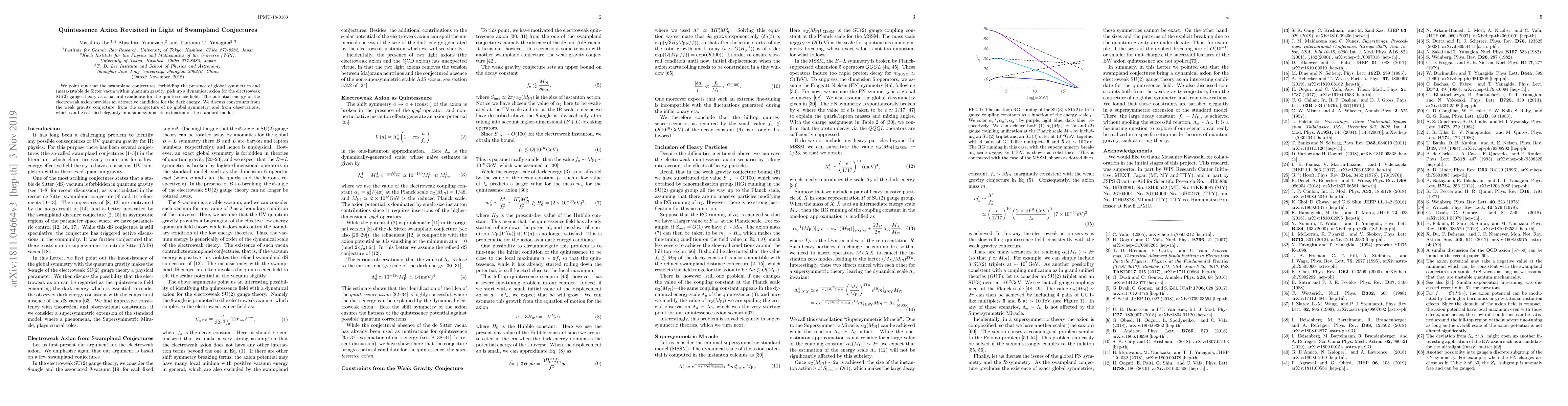 We point out that the swampland conjectures, forbidding the presence of global symmetries and (meta-)stable de Sitter vacua within quantum gravity, pick up a dynamical axion for the electroweak SU(2) gauge theory as a natural candidate for the quintessence field. The potential energy of the electroweak axion provides an attractive candidate for the dark energy. We discuss constraints from the weak gravity conjecture, from the conjecture of no global symmetry, and from observations, which can be satisfied elegantly in a supersymmetric extension of the standard model.