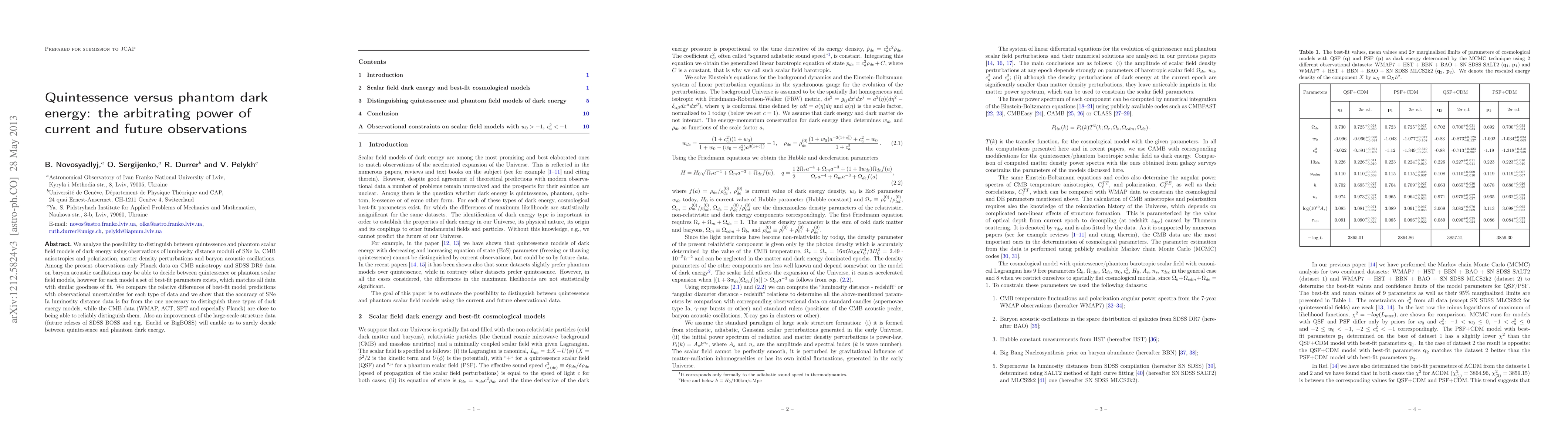 This paper examines the potential to differentiate between quintessence and phantom dark energy models using current and future observational data, including SNe Ia, CMB, and large-scale structure measurements. While current data can only hint at distinctions, future improvements in large-scale structure data from surveys like Euclid or BigBOSS may provide the necessary precision to clearly differentiate between the models.