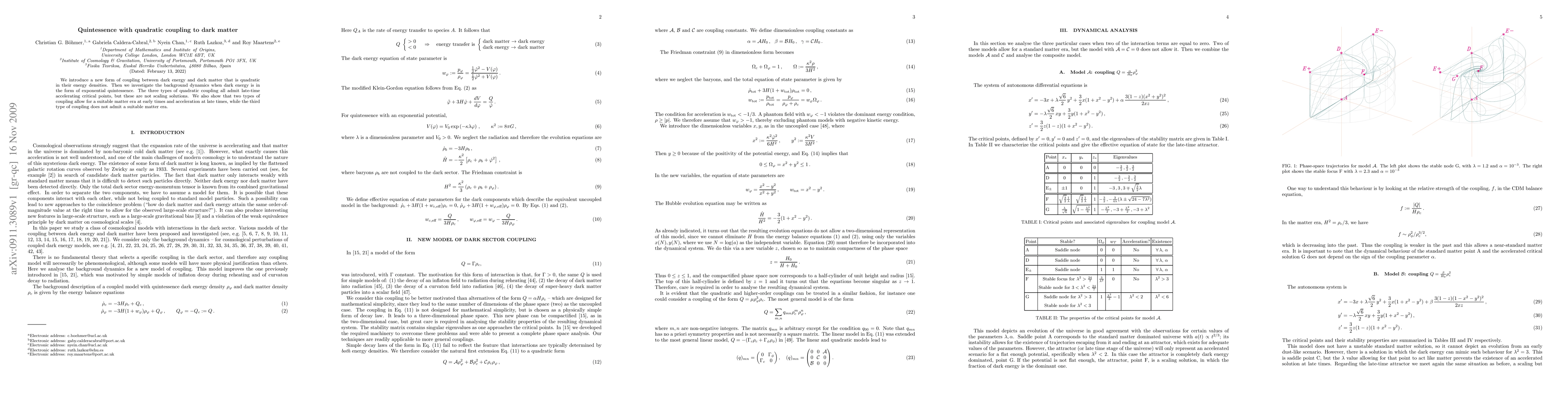 This paper explores a quadratic coupling between dark energy (quintessence) and dark matter, finding that it allows for late-time acceleration but lacks scaling solutions. Two types of coupling permit early matter domination and late-time acceleration, while the third type does not support a suitable matter era.
