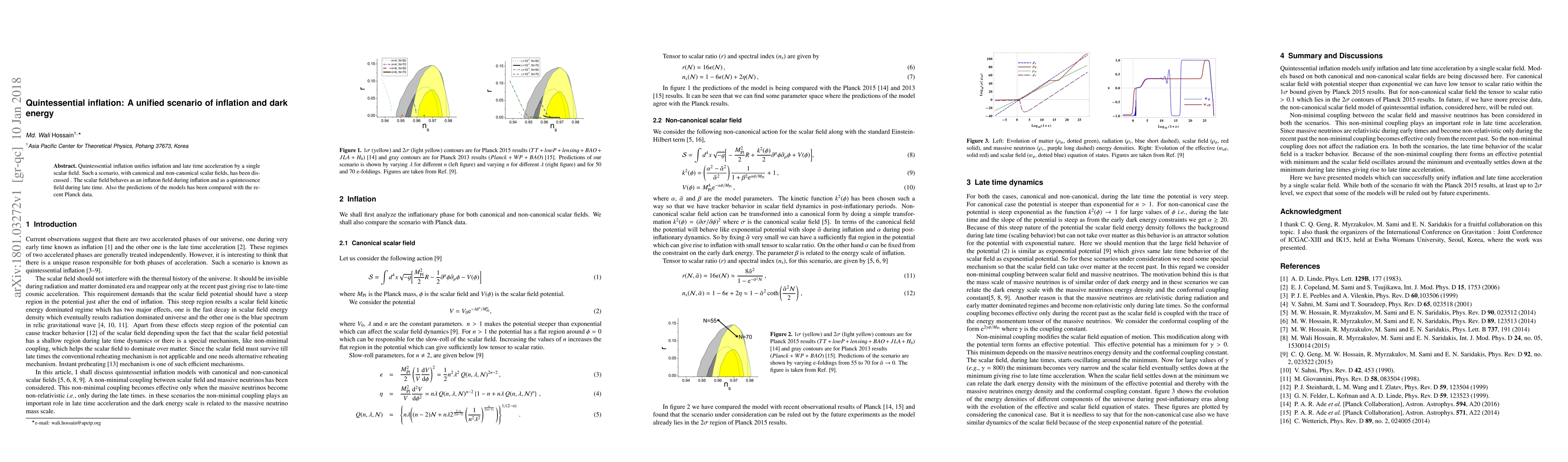 Summary: This paper explores quintessential inflation, a unified model where a single scalar field drives both inflation and late-time cosmic acceleration. The model's predictions are compared with recent Planck data to validate its consistency.