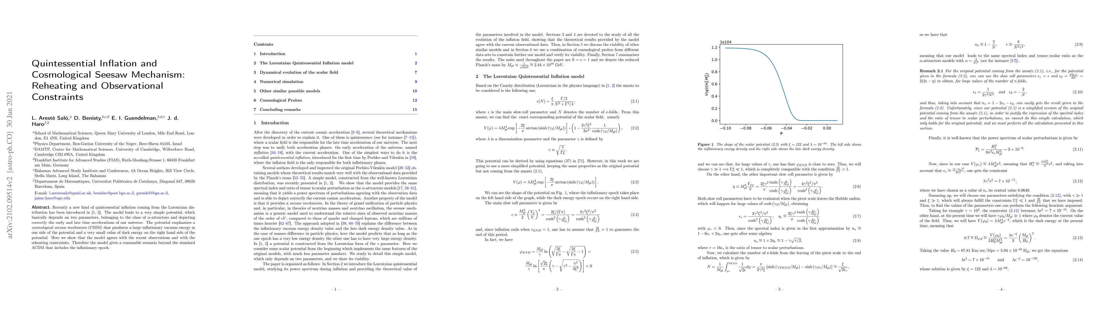 Recently a new kind of quintessential inflation coming from the Lorentzian distribution has been introduced in [1,2]. The model leads to a very simple potential, which basically depends on two parameters, belonging to the class of $\alpha$-attractors and depicting correctly the early and late time accelerations of our universe. The potential emphasizes a {\it cosmological seesaw mechanism} (CSSM) that produces a large inflationary vacuum energy in one side of the potential and a very small value of dark energy on the right hand side of the potential. {Here we show that the model agrees with the recent observations and with the reheating constraints. Therefore the model gives a reasonable scenario beyond the standard $\Lambda$CDM that includes the inflationary epoch.}