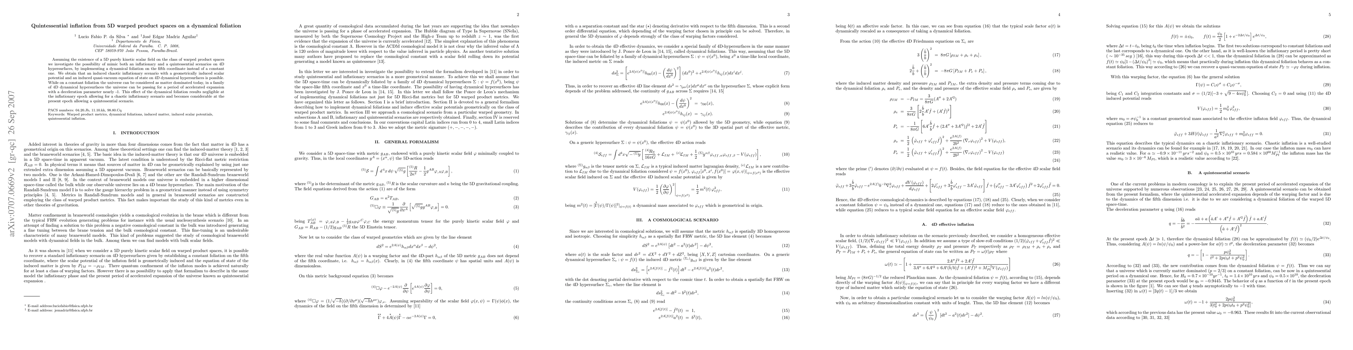 Assuming the existence of a 5D purely kinetic scalar field on the class of warped product spaces we investigate the possibility of mimic both an inflationary and a quintessential scenarios on 4D hypersurfaces, by implementing a dynamical foliation on the fifth coordinate instead of a constant one. We obtain that an induced chaotic inflationary scenario with a geometrically induced scalar potential and an induced quasi-vacuum equation of state on 4D dynamical hypersurfaces is possible. While on a constant foliation the universe can be considered as matter dominated today, in a family of 4D dynamical hypersurfaces the universe can be passing for a period of accelerated expansion with a deceleration parameter nearly -1. This effect of the dynamical foliation results negligible at the inflationary epoch allowing for a chaotic scenario and becomes considerable at the present epoch allowing a quintessential scenario.