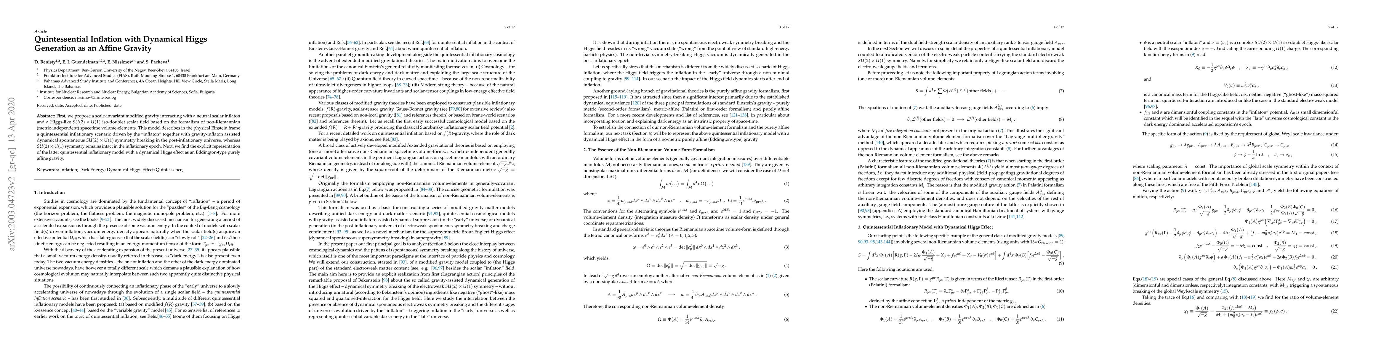 First, we propose a scale-invariant modified gravity interacting with a neutral scalar "inflaton" and a Higgs-like SU(2)xU(1) iso-doublet scalar field based on the formalism of non-Riemannian (metric-independent) spacetime volume-elements. This model describes in the physical Einstein frame a quintessential inflationary scenario driven by the "inflaton" together with gravity-inflaton assisted dynamical spontaneous SU(2)xU(1) symmetry breaking in the post-inflationary universe, whereas SU(2)xU(1) symmetry remains intact in the inflationary epoch. Next, we find the explicit representation of the latter quintessential inflationary model with a dynamical Higgs effect as an Eddington-type purely affine gravity.