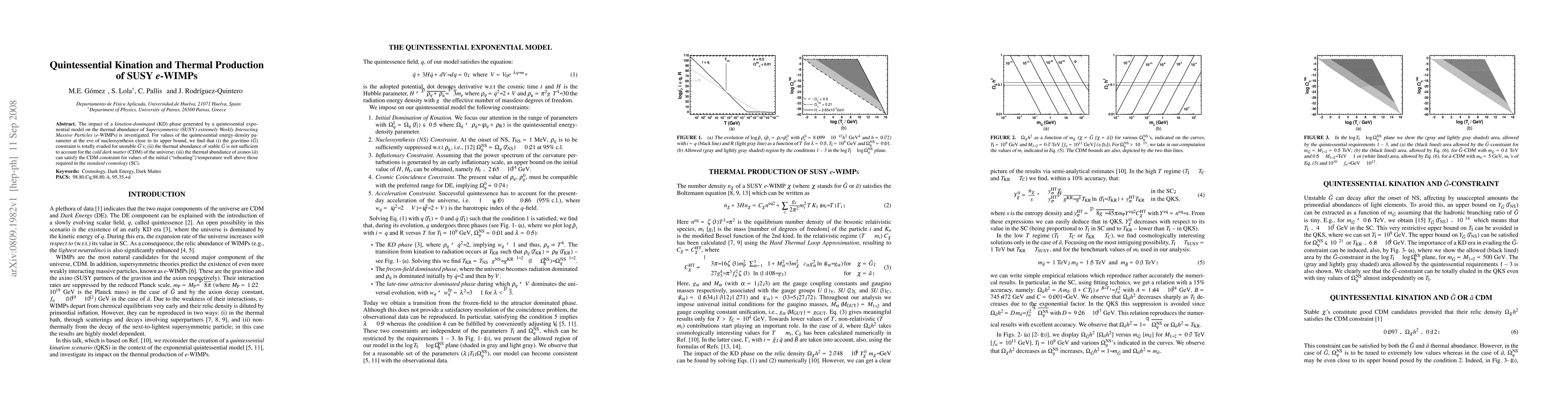 This paper examines how a kination-dominated phase from a quintessential model affects the thermal production of SUSY e-WIMPs. It finds that this phase allows for the gravitino constraint to be evaded and suggests that axinos can meet cold dark matter requirements at higher reheating temperatures than standard cosmology.