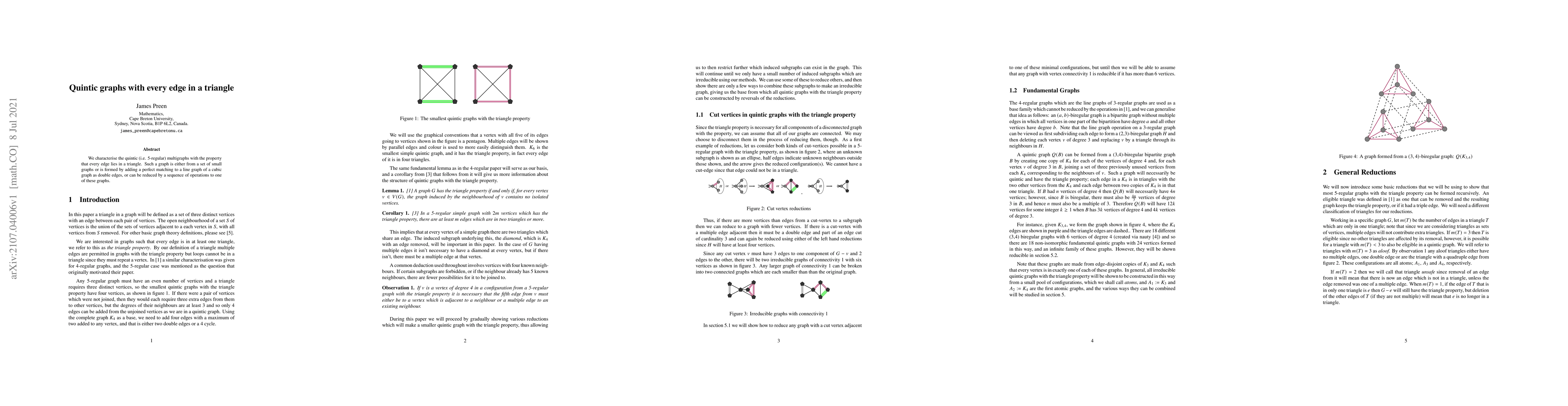 Summary: The paper characterizes quintic multigraphs where every edge is part of a triangle, identifying that such graphs are either small specific graphs or derived from cubic graphs through specific constructions and reductions.
