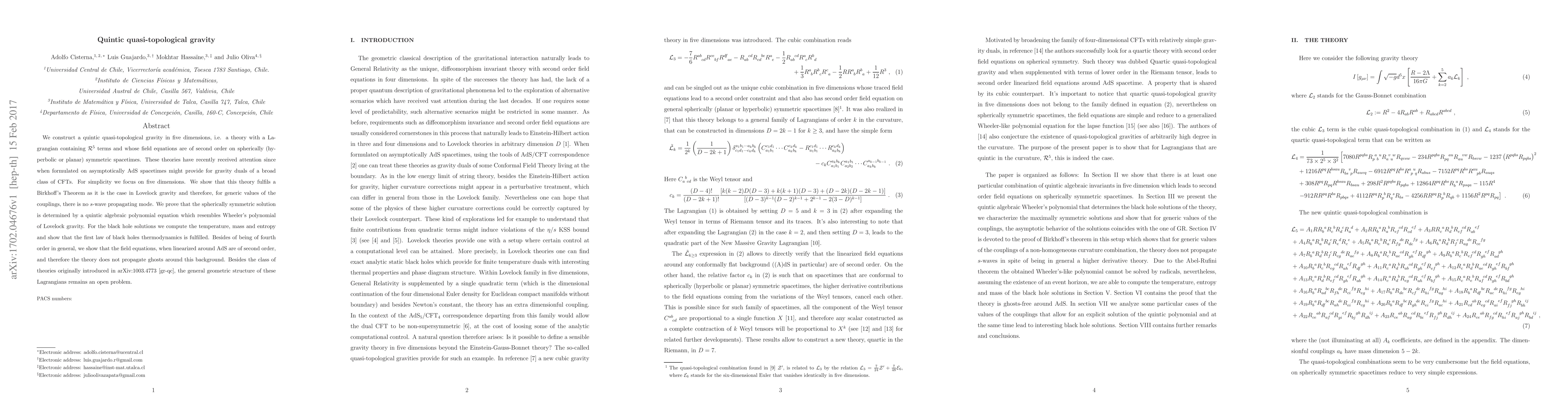 We construct a quintic quasi-topological gravity in five dimensions, i.e. a theory with a Lagrangian containing $\mathcal{R}^5$ terms and whose field equations are of second order on spherically (hyperbolic or planar) symmetric spacetimes. These theories have recently received attention since when formulated on asymptotically AdS spacetimes might provide for gravity duals of a broad class of CFTs. For simplicity we focus on five dimensions. We show that this theory fulfils a Birkhoff's Theorem as it is the case in Lovelock gravity and therefore, for generic values of the couplings, there is no s-wave propagating mode. We prove that the spherically symmetric solution is determined by a quintic algebraic polynomial equation which resembles Wheeler's polynomial of Lovelock gravity. For the black hole solutions we compute the temperature, mass and entropy and show that the first law of black holes thermodynamics is fulfilled. Besides of being of fourth order in general, we show that the field equations, when linearized around AdS are of second order, and therefore the theory does not propagate ghosts around this background. Besides the class of theories originally introduced in arXiv:1003.4773 [gr-qc], the general geometric structure of these Lagrangians remains an open problem.
