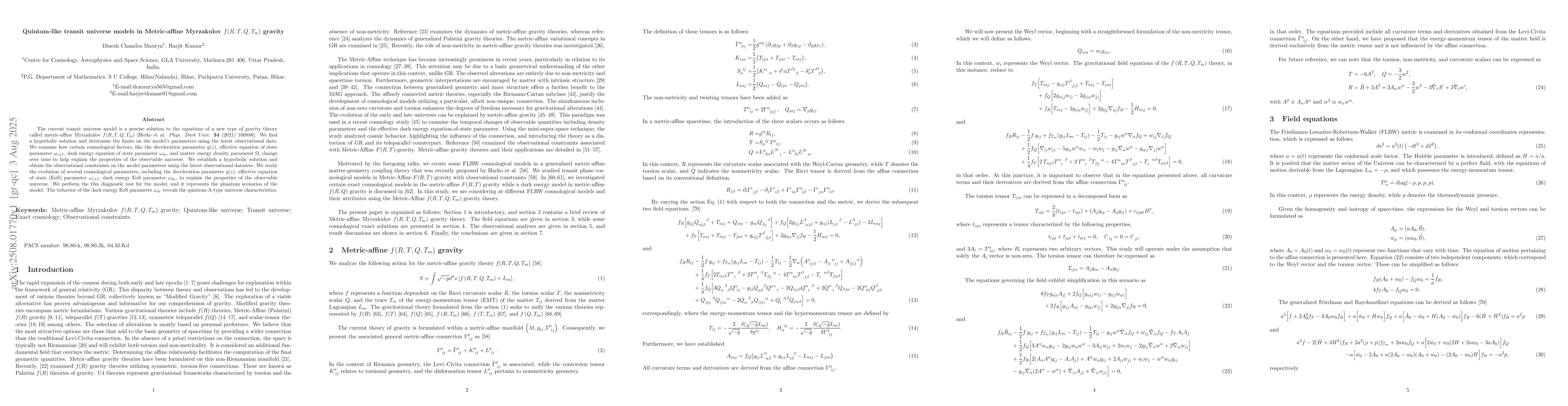 The current transit universe model is a precise solution to the equations of a new type of gravity theory called metric-affine Myrzakulov $f(R,T,Q,T_m)$ [Herko et al. Phys. Dark Univ. 34 (2021) 100886]. We find a hyperbolic solution and determine the limits on the model's parameters using the latest observational data. We examine how certain cosmological factors, like the deceleration parameter $q(z)$, effective equation of state parameter $\omega_{eff}$, dark energy equation of state parameter $\omega_{de}$, and matter energy density parameter $\Omega$, change over time to help explain the properties of the observable universe. We establish a hyperbolic solution and obtain the observational constraints on the model parameters using the latest observational datasets. We study the evolution of several cosmological parameters, including the deceleration parameter $q(z)$, effective equation of state (EoS) parameter $\omega_{eff}$, dark energy EoS parameter $\omega_{de}$, to explain the properties of the observable universe. We perform the Om diagnostic test for the model, and it represents the phantom scenarios of the model. The behavior of the dark energy EoS parameter $\omega_{de}$ reveals the quintom-A-type universe characteristics.