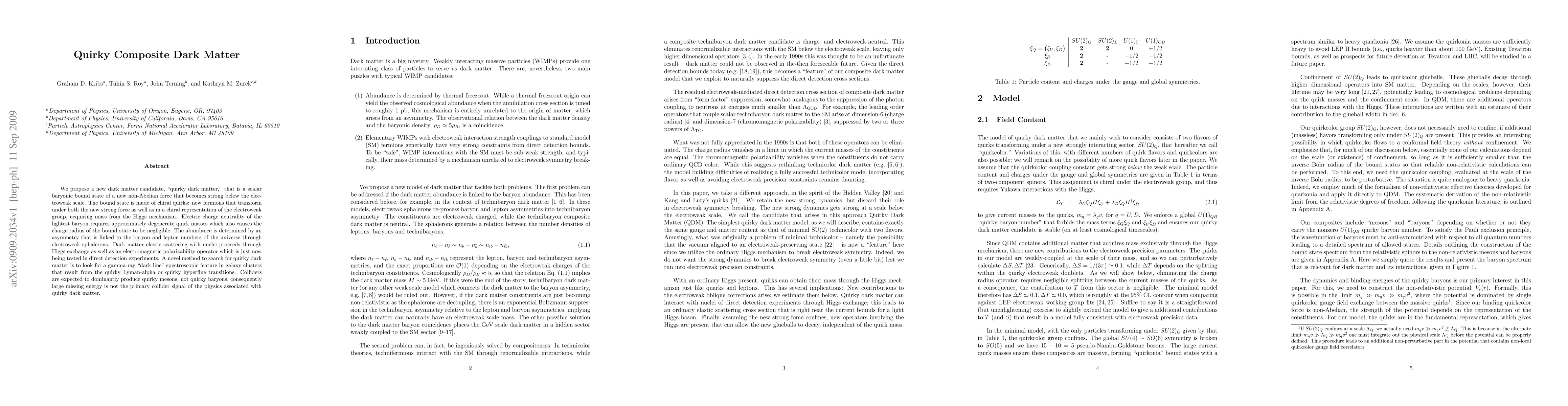 This paper proposes quirky dark matter, a scalar baryonic bound state from a new non-Abelian force, composed of chiral quirks that acquire mass via the Higgs mechanism. The search for this dark matter includes direct detection experiments and gamma-ray spectroscopy in galaxy clusters.