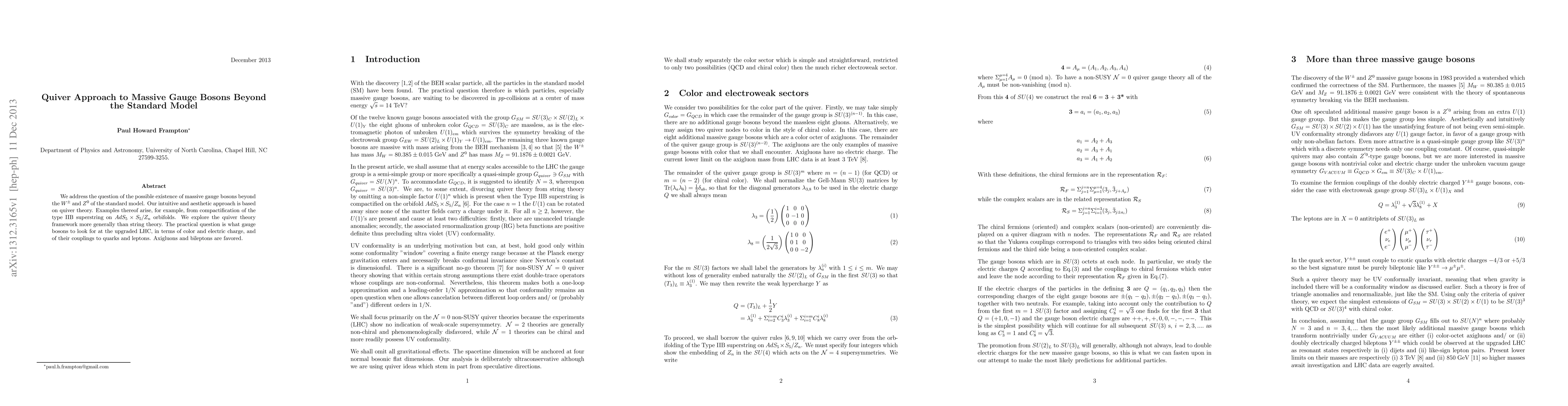 This paper explores the existence of massive gauge bosons beyond the Standard Model using quiver theory, specifically from compactifications of type IIB superstring theory. It focuses on potential new gauge bosons like axigluons and bileptons that could be detected at future LHC upgrades.