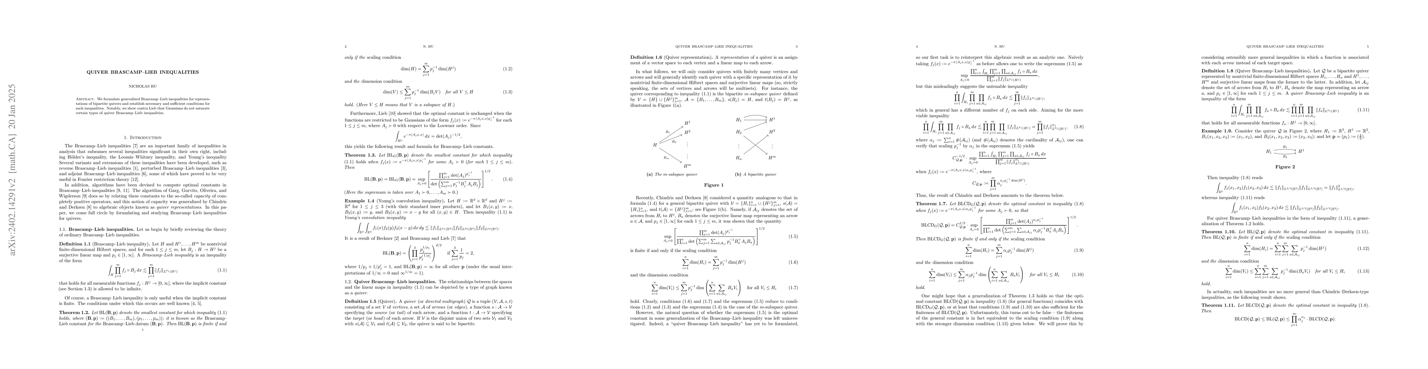 Summary: This paper formulates generalized Brascamp-Lieb inequalities for bipartite quiver representations and provides necessary and sufficient conditions for these inequalities, demonstrating that Gaussians alone are insufficient in the quiver context.