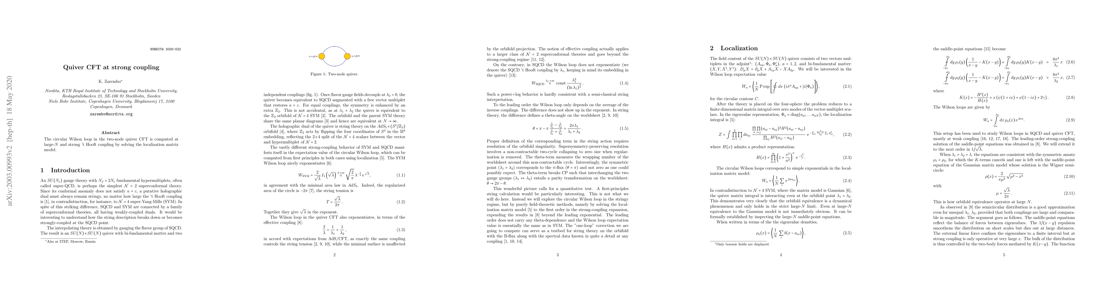 The circular Wilson loop in the two-node quiver CFT is computed at large-N and strong 't Hooft coupling by solving the localization matrix model.