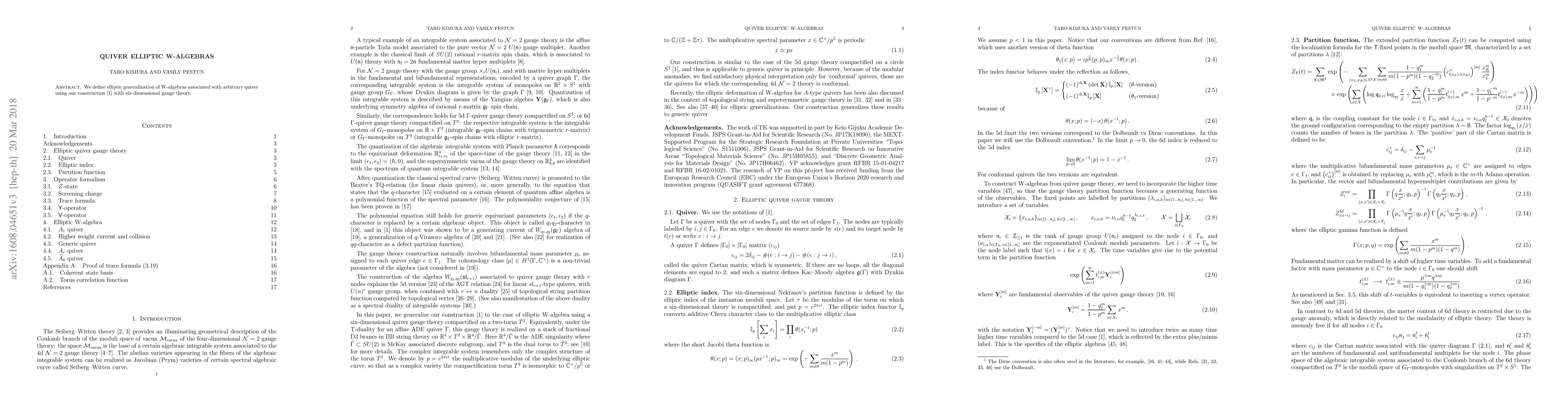 Summary: This paper introduces an elliptic generalization of W-algebras linked to arbitrary quivers, utilizing a formalism developed for six-dimensional quiver gauge theory compactified on an elliptic curve. The construction provides new insights into the algebraic structures underlying these generalized W-algebras.
