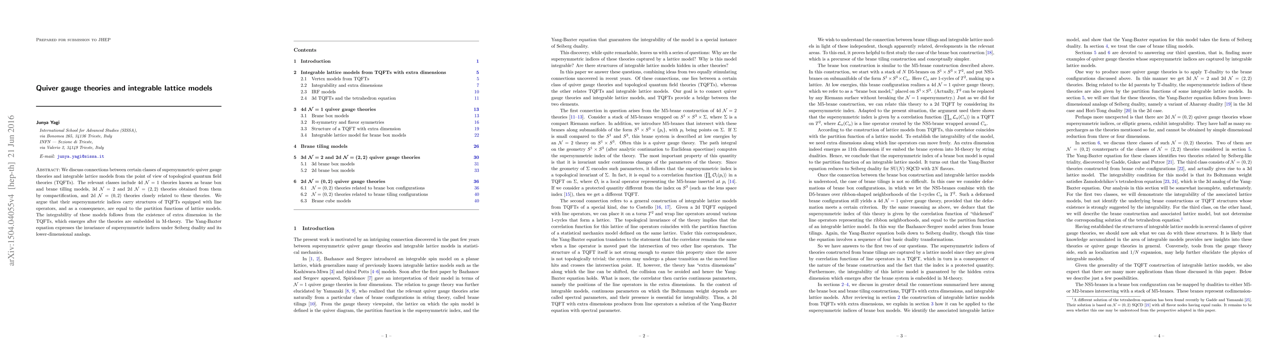 This paper explores the relationships between supersymmetric quiver gauge theories and integrable lattice models through the lens of topological quantum field theories (TQFTs). It demonstrates that the supersymmetric indices of these gauge theories correspond to the partition functions of integrable lattice models, with the integrability stemming from the extra dimension introduced in M-theory.