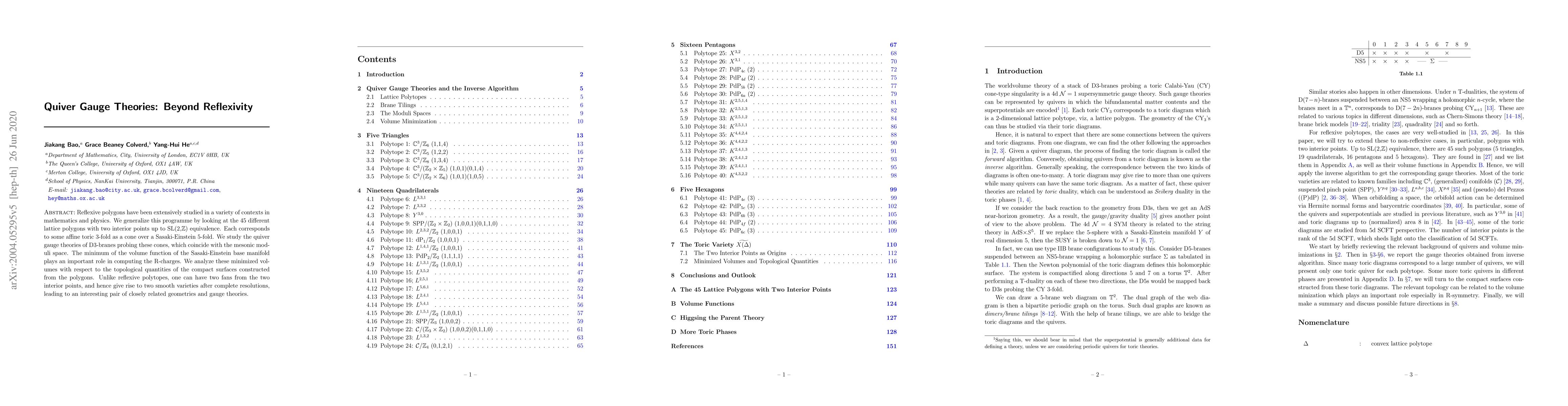 Reflexive polygons have been extensively studied in a variety of contexts in mathematics and physics. We generalize this programme by looking at the 45 different lattice polygons with two interior points up to SL(2,$\mathbb{Z}$) equivalence. Each corresponds to some affine toric 3-fold as a cone over a Sasaki-Einstein 5-fold. We study the quiver gauge theories of D3-branes probing these cones, which coincide with the mesonic moduli space. The minimum of the volume function of the Sasaki-Einstein base manifold plays an important role in computing the R-charges. We analyze these minimized volumes with respect to the topological quantities of the compact surfaces constructed from the polygons. Unlike reflexive polytopes, one can have two fans from the two interior points, and hence give rise to two smooth varieties after complete resolutions, leading to an interesting pair of closely related geometries and gauge theories.