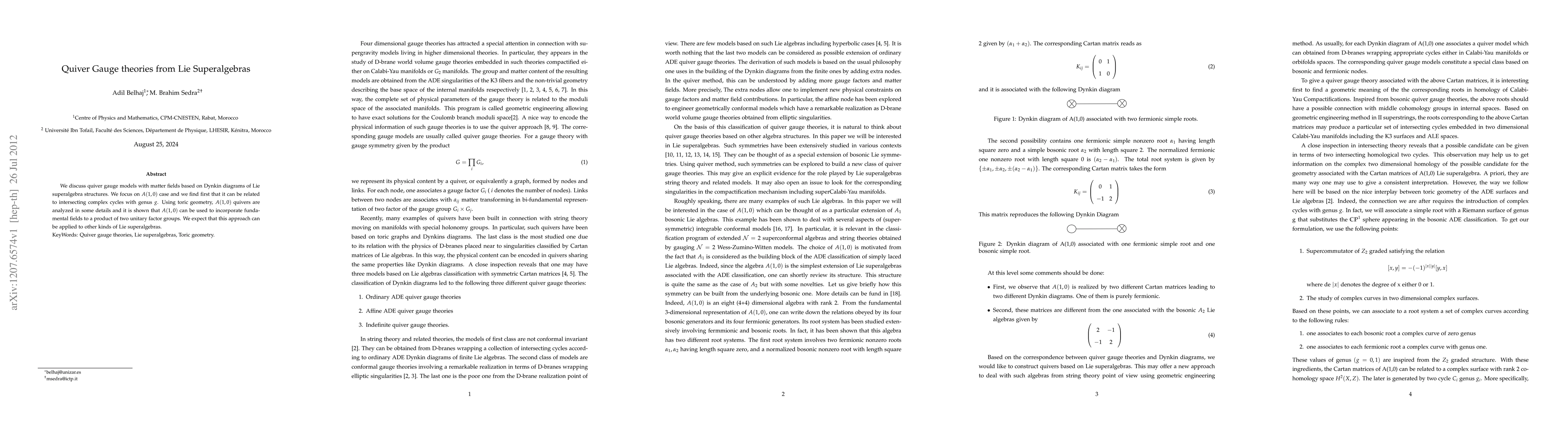Summary: This paper explores quiver gauge theories based on the Dynkin diagrams of Lie superalgebras, specifically focusing on the A(1,0) case. It demonstrates a connection between A(1,0) quivers and intersecting complex cycles using toric geometry, and shows how A(1,0) can integrate fundamental fields into a product of two unitary groups.