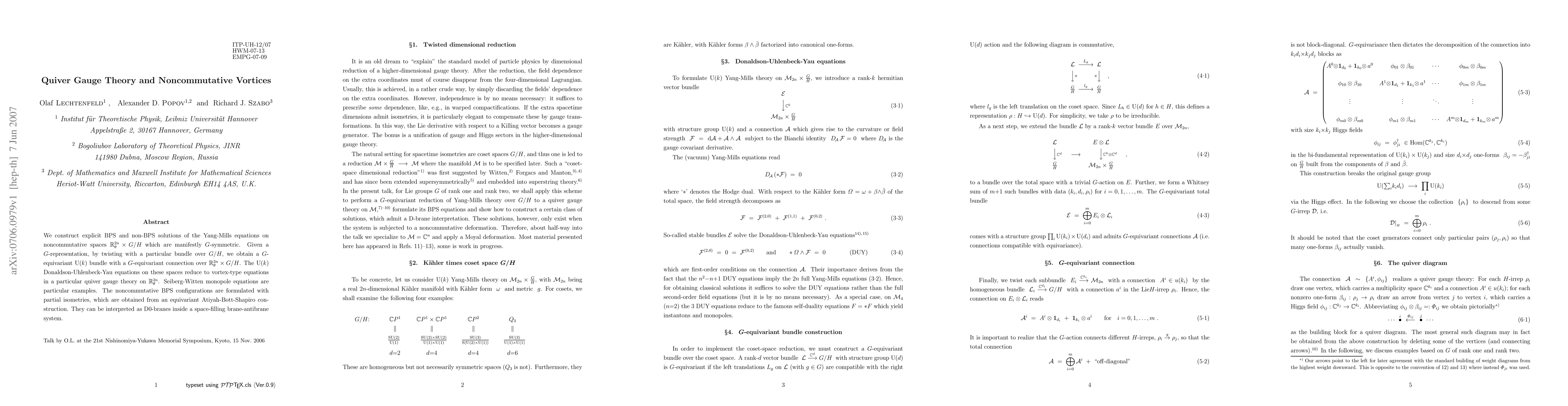 We construct explicit BPS and non-BPS solutions of the Yang-Mills equations on noncommutative spaces R^{2n}_theta x G/H which are manifestly G-symmetric. Given a G-representation, by twisting with a particular bundle over G/H, we obtain a G-equivariant U(k) bundle with a G-equivariant connection over R^{2n}_theta x G/H. The U(k) Donaldson-Uhlenbeck-Yau equations on these spaces reduce to vortex-type equations in a particular quiver gauge theory on R^{2n}_theta. Seiberg-Witten monopole equations are particular examples. The noncommutative BPS configurations are formulated with partial isometries, which are obtained from an equivariant Atiyah-Bott-Shapiro construction. They can be interpreted as D0-branes inside a space-filling brane-antibrane system.