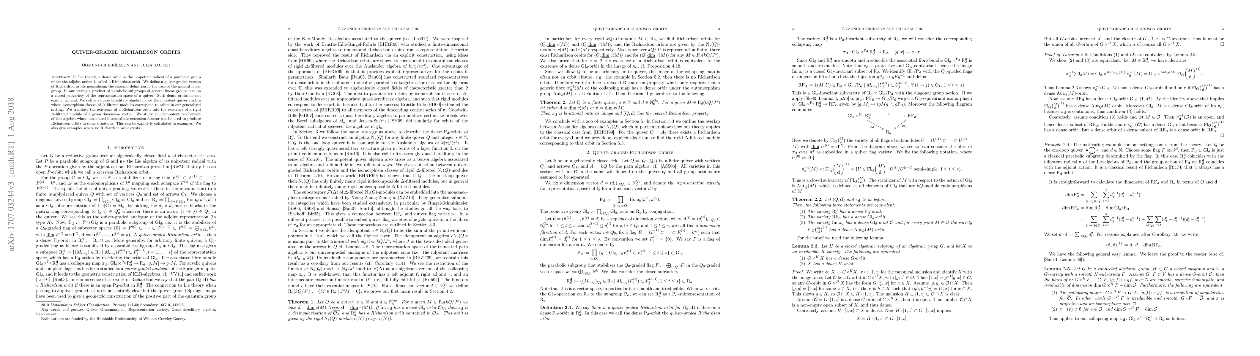This paper defines a quiver-graded version of Richardson orbits in the context of parabolic subgroups acting on representation spaces of quivers. It introduces a quasi-hereditary nilpotent quiver algebra whose modules correspond to these orbits, and explores conditions under which such orbits exist.
