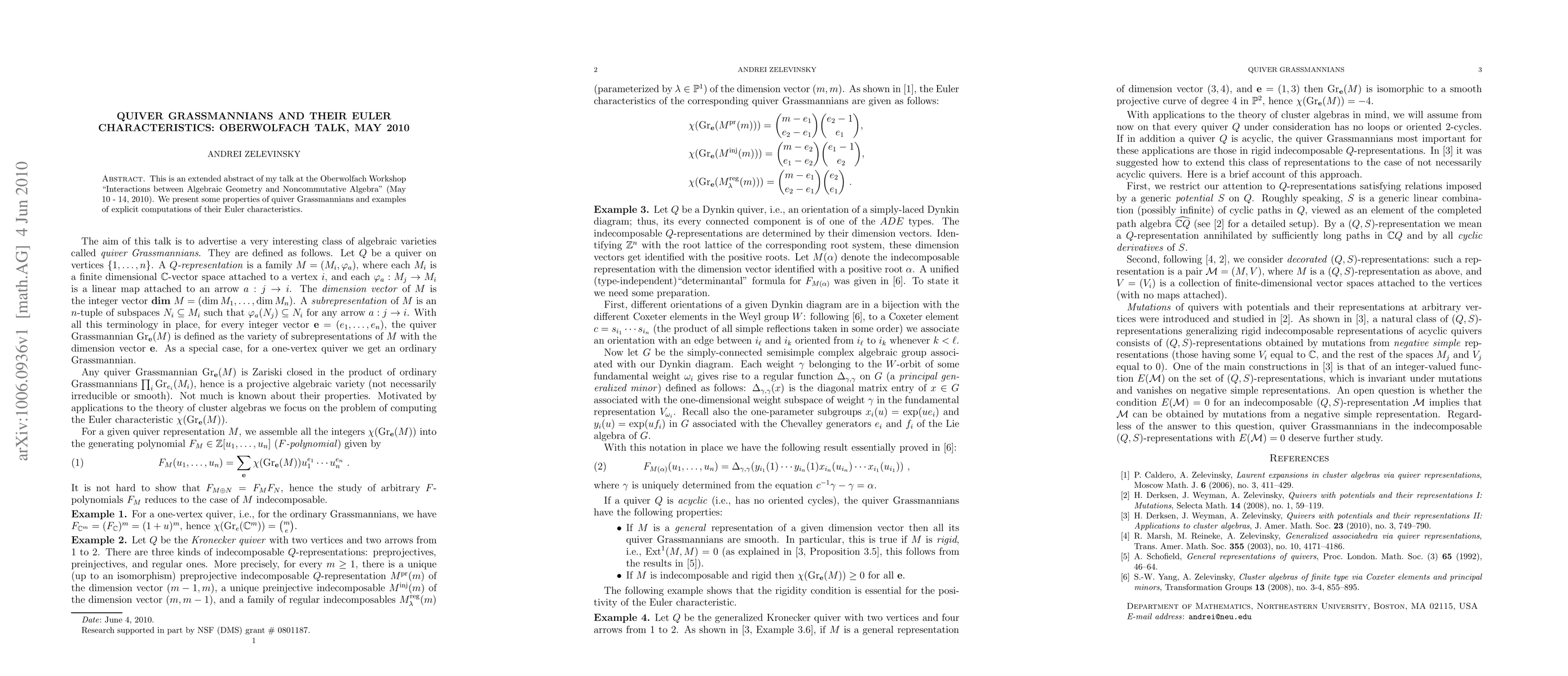 This paper discusses the properties of quiver Grassmannians and provides explicit computations of their Euler characteristics, presented at the Oberwolfach Workshop on Algebraic Geometry and Noncommutative Algebra in May 2010. The focus is on understanding these geometric objects through their combinatorial and algebraic features.
