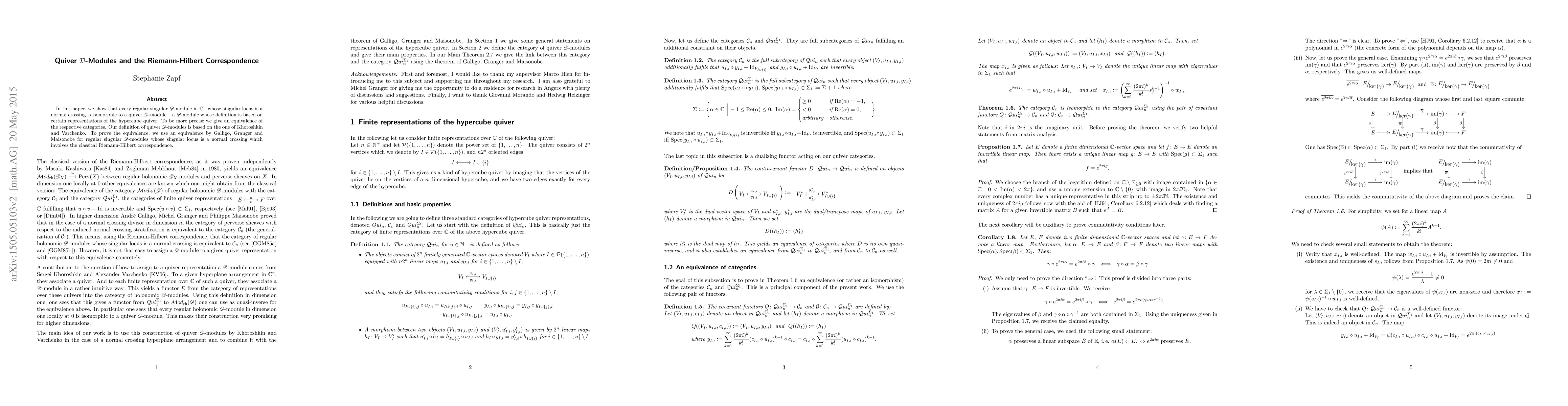 This paper establishes an equivalence between regular singular $\mathscr{D}$-modules in $\mathbb{C}^n$ with normal crossing singularities and quiver $\mathscr{D}$-modules, using the Riemann-Hilbert correspondence to prove the result. The definition of quiver $\mathscr{D}$-modules follows Khoroshkin and Varchenko.