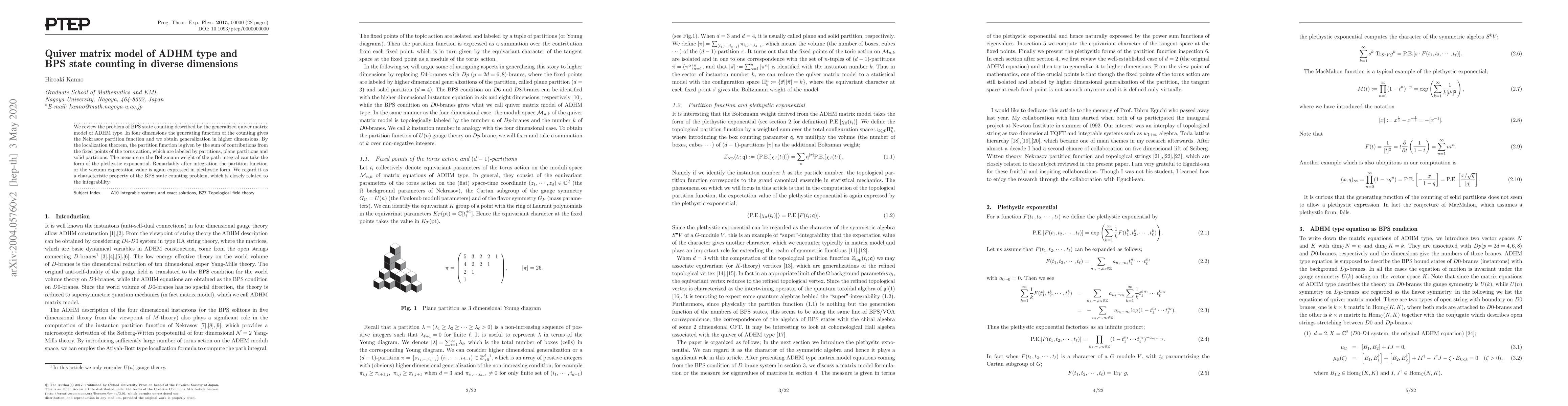 We review the problem of BPS state counting described by the generalized quiver matrix model of ADHM type. In four dimensions the generating function of the counting gives the Nekrasov partition function and we obtain generalization in higher dimensions. By the localization theorem, the partition function is given by the sum of contributions from the fixed points of the torus action, which are labeled by partitions, plane partitions and solid partitions. The measure or the Boltzmann weight of the path integral can take the form of the plethystic exponential. Remarkably after integration the partition function or the vacuum expectation value is again expressed in plethystic form. We regard it as a characteristic property of the BPS state counting problem, which is closely related to the integrability.