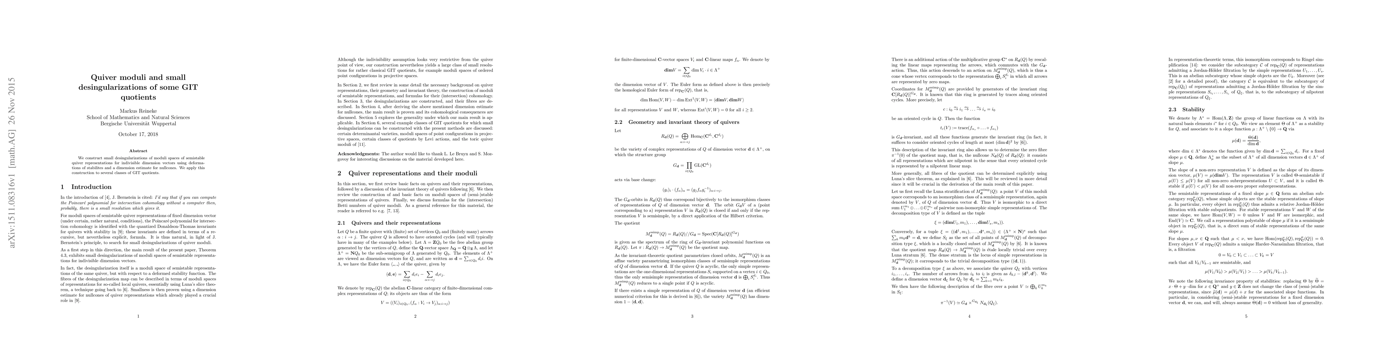 The paper constructs small desingularizations for moduli spaces of semistable quiver representations with indivisible dimension vectors through deformations of stability and dimension estimates for nullcones. It further applies this methodology to various classes of GIT quotients.