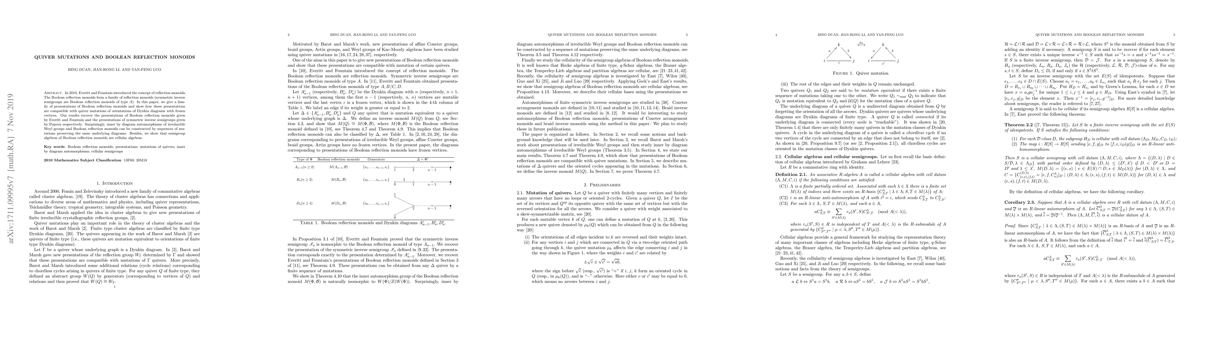 This paper presents a family of compatible presentations for Boolean reflection monoids, linking them to quiver mutations of Dynkin diagrams with frozen vertices. It demonstrates that these presentations recover existing results and shows that semigroup algebras of Boolean reflection monoids are cellular algebras.