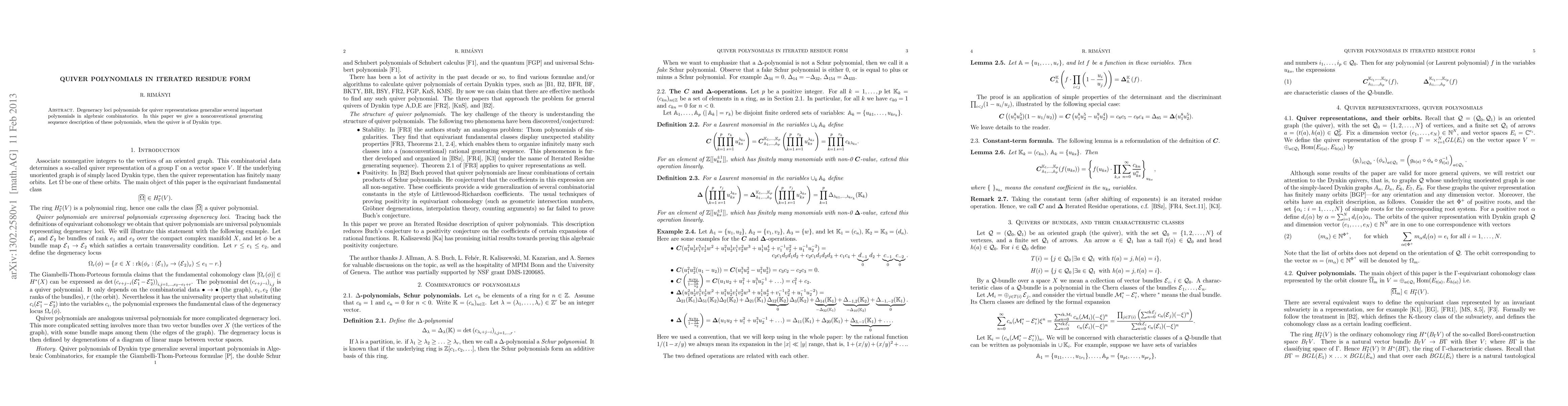 Degeneracy loci polynomials for quiver representations generalize several important polynomials in algebraic combinatorics. In this paper we give a nonconventional generating sequence description of these polynomials, when the quiver is of Dynkin type.