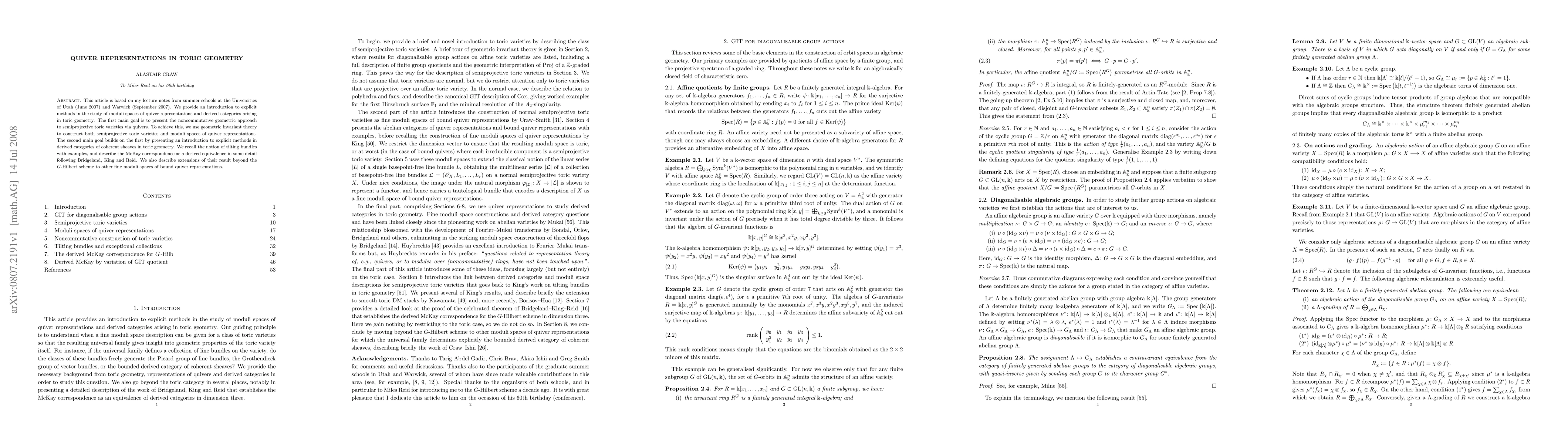 This paper introduces methods for studying moduli spaces of quiver representations and derived categories in toric geometry, focusing on noncommutative geometric approaches and utilizing geometric invariant theory. It also explores derived categories, tilting bundles, and the McKay correspondence, extending results beyond the $G$-Hilbert scheme.