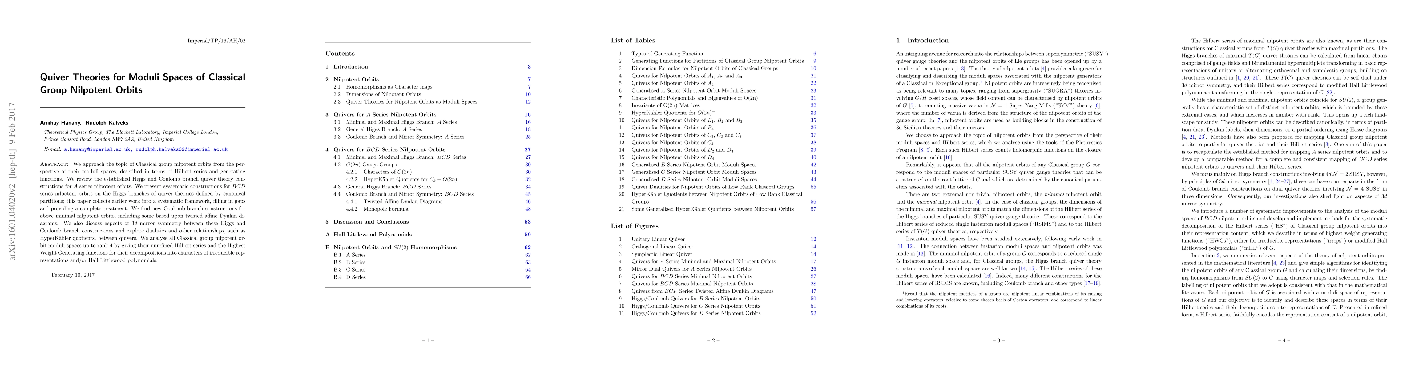 We approach the topic of Classical group nilpotent orbits from the perspective of their moduli spaces, described in terms of Hilbert series and generating functions. We review the established Higgs and Coulomb branch quiver theory constructions for A series nilpotent orbits. We present systematic constructions for BCD series nilpotent orbits on the Higgs branches of quiver theories defined by canonical partitions; this paper collects earlier work into a systematic framework, filling in gaps and providing a complete treatment. We find new Coulomb branch constructions for above minimal nilpotent orbits, including some based upon twisted affine Dynkin diagrams. We also discuss aspects of 3d mirror symmetry between these Higgs and Coulomb branch constructions and explore dualities and other relationships, such as HyperKahler quotients, between quivers. We analyse all Classical group nilpotent orbit moduli spaces up to rank 4 by giving their unrefined Hilbert series and the Highest Weight Generating functions for their decompositions into characters of irreducible representations and/or Hall Littlewood polynomials.
