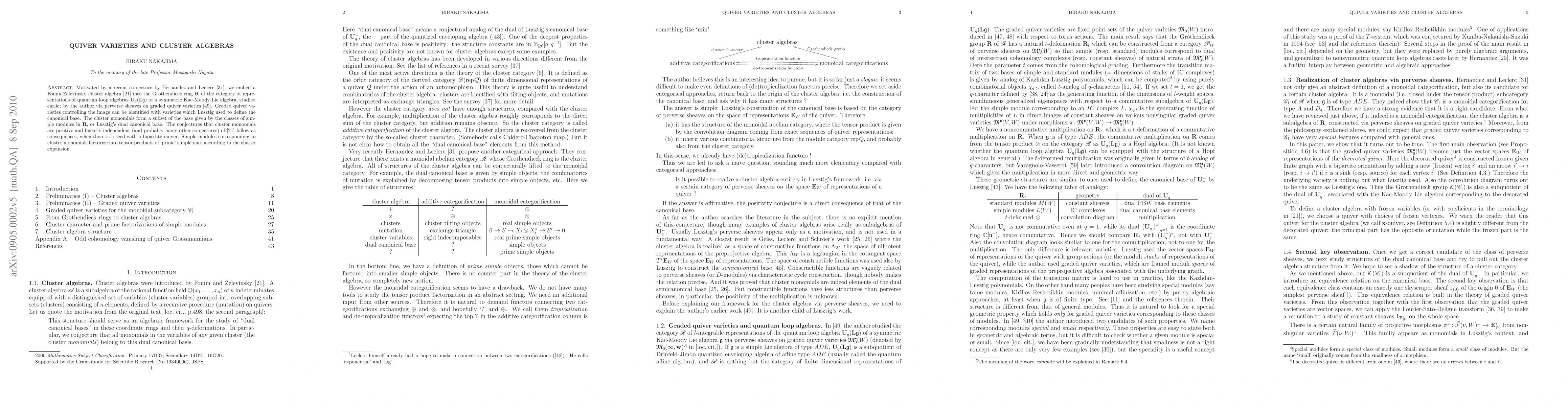 Motivated by a recent conjecture by Hernandez and Leclerc [arXiv:0903.1452], we embed a Fomin-Zelevinsky cluster algebra [arXiv:math/0104151] into the Grothendieck ring R of the category of representations of quantum loop algebras U_q(Lg) of a symmetric Kac-Moody Lie algebra g, studied earlier by the author via perverse sheaves on graded quiver varieties [arXiv:math/9912158]. Graded quiver varieties controlling the image can be identified with varieties which Lusztig used to define the canonical base. The cluster monomials form a subset of the base given by the classes of simple modules in R, or Lusztig's dual canonical base. The positivity and linearly independence (and probably many other) conjectures of cluster monomials [arXiv:math/0104151] follow as consequences, when there is a seed with a bipartite quiver. Simple modules corresponding to cluster monomials factorize into tensor products of `prime' simple ones according to the cluster expansion.