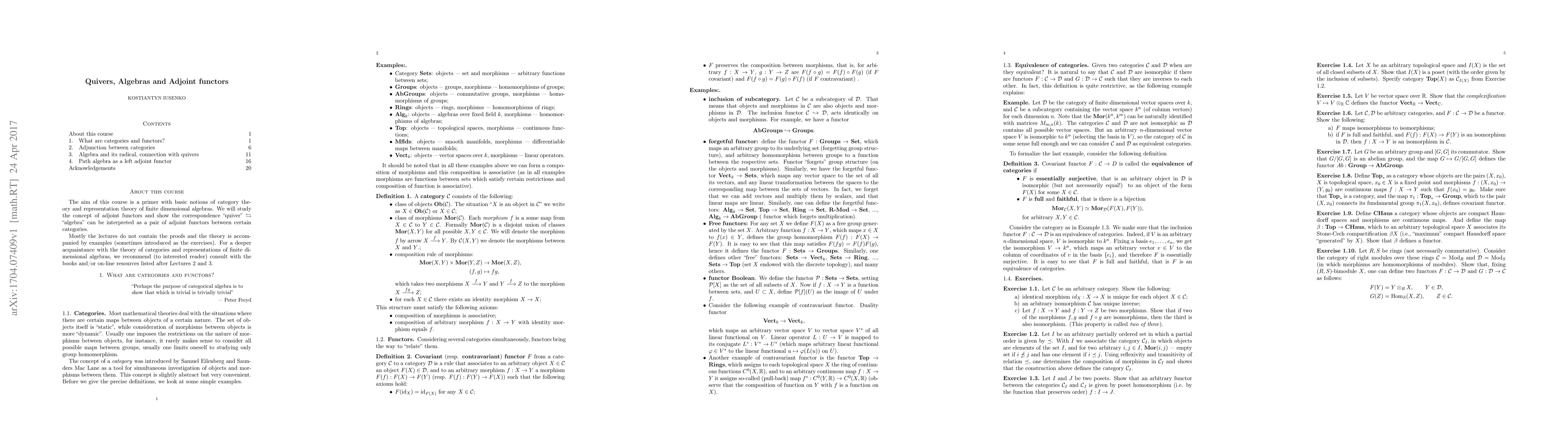 The paper provides a minicourse notes on category theory and representation theory of finite-dimensional algebras, introducing adjoint functors and demonstrating that the 'quiver' <-> 'algebra' construction can be interpreted as a pair of adjoint functors between certain categories.