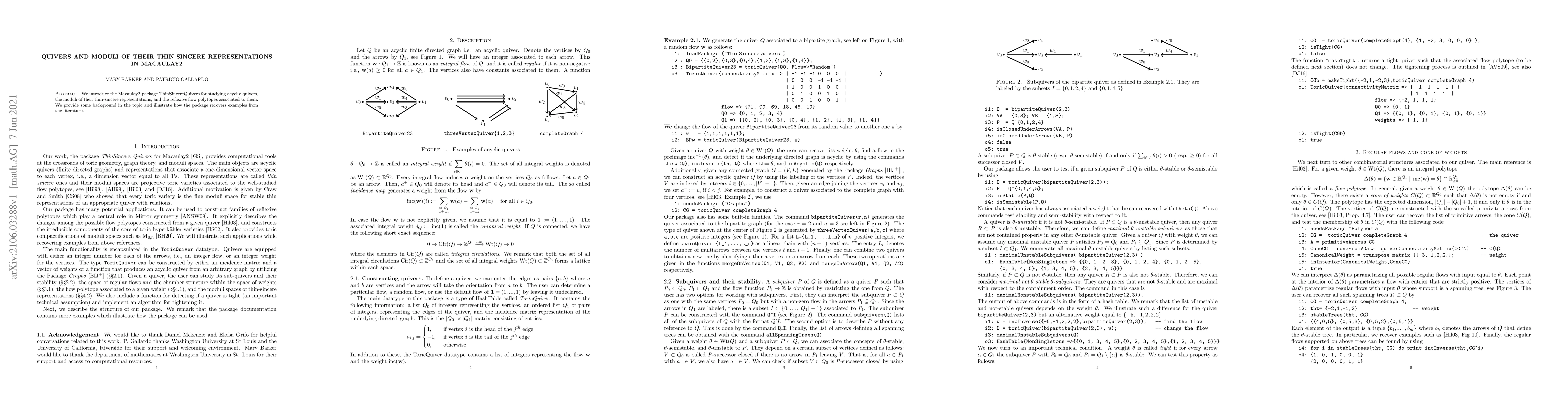 Summary: This paper introduces a Macaulay2 package, ThinSincereQuivers, for exploring acyclic quivers, their thin-sincere representations' moduli, and related reflexive flow polytopes, with examples drawn from existing literature. The work offers background and demonstrates the package's capabilities.