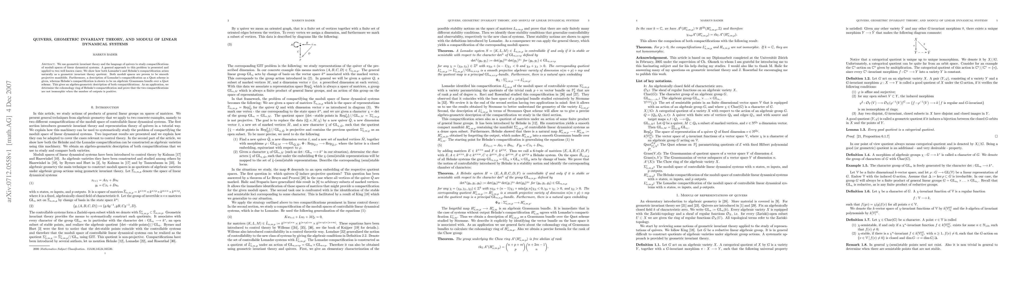This paper utilizes geometric invariant theory and quivers to compactification moduli spaces of linear dynamical systems, showing both Lomadze's and Helmke's compactifications arise naturally as geometric invariant theory quotients. It determines the cohomology ring of Helmke's compactification and proves the two compactifications are non-isomorphic when the number of outputs is positive.