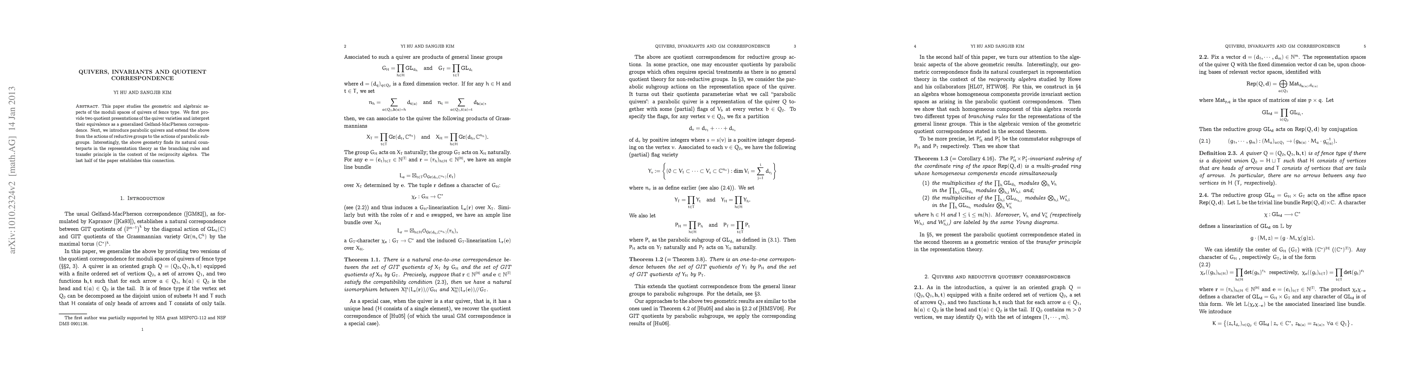 This paper studies the geometric and algebraic aspects of the moduli spaces of quivers of fence type. We first provide two quotient presentations of the quiver varieties and interpret their equivalence as a generalized Gelfand-MacPherson correspondence. Next, we introduce parabolic quivers and extend the above from the actions of reductive groups to the actions of parabolic subgroups. Interestingly, the above geometry finds its natural counterparts in the representation theory as the branching rules and transfer principle in the context of the reciprocity algebra. The last half of the paper establishes this connection.