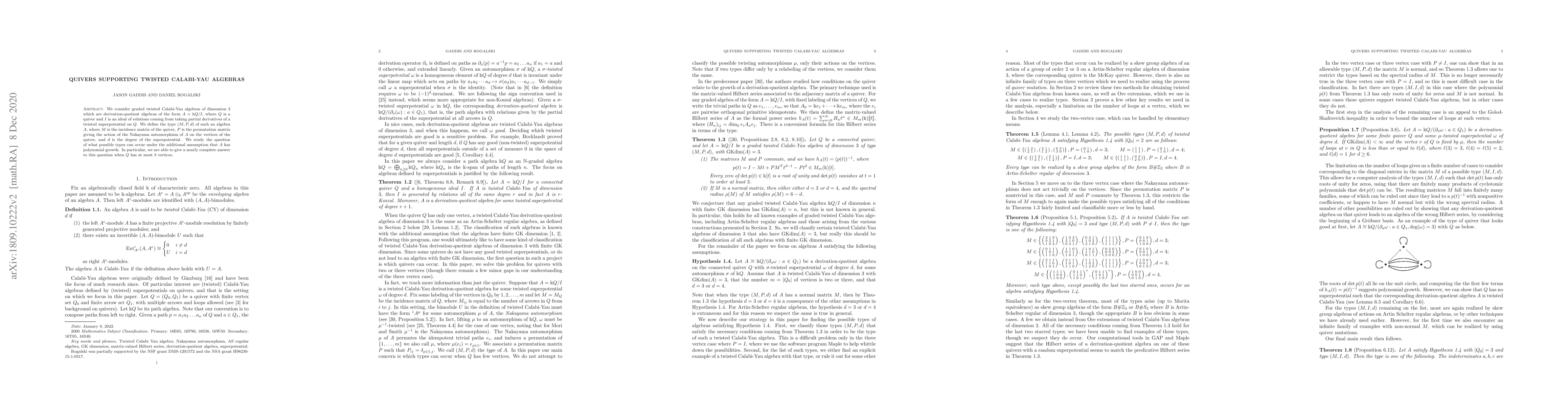 We consider graded twisted Calabi-Yau algebras of dimension 3 which are derivation-quotient algebras of the form $A = \kk Q/I$, where $Q$ is a quiver and $I$ is an ideal of relations coming from taking partial derivatives of a twisted superpotential on $Q$. We define the type $(M, P, d)$ of such an algebra $A$, where $M$ is the incidence matrix of the quiver, $P$ is the permutation matrix giving the action of the Nakayama automorphism of $A$ on the vertices of the quiver, and $d$ is the degree of the superpotential. We study the question of what possible types can occur under the additional assumption that $A$ has polynomial growth. In particular, we are able to give a nearly complete answer to this question when $Q$ has at most 3 vertices.