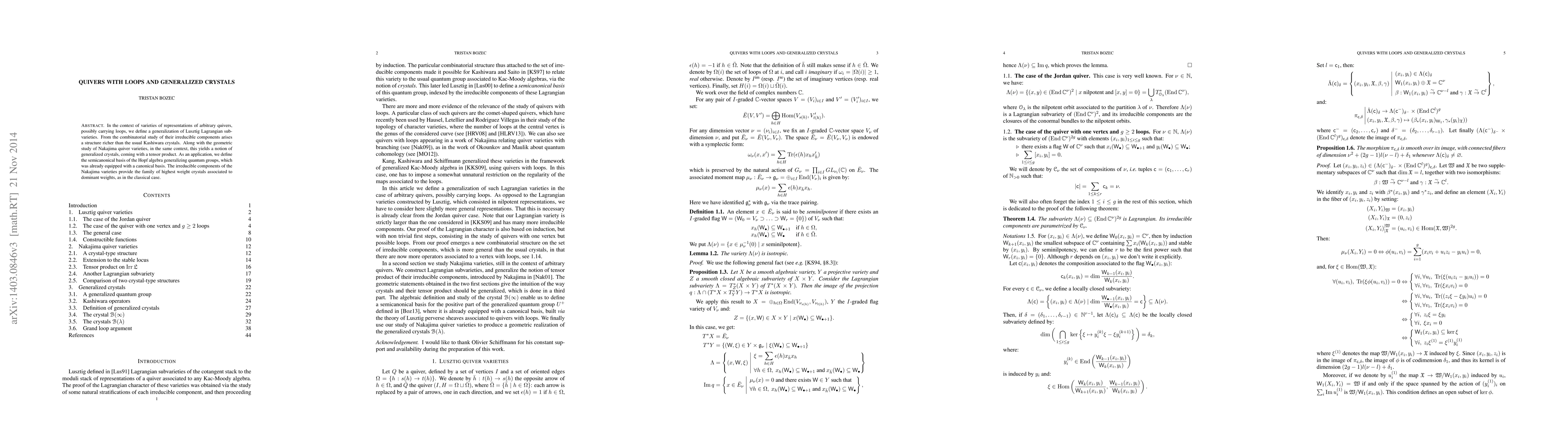 In the context of varieties of representations of arbitrary quivers, possibly carrying loops, we define a generalization of Lusztig Lagrangian subvarieties. From the combinatorial study of their irreducible components arises a structure richer than the usual Kashiwara crystals. Along with the geometric study of Nakajima quiver varieties, in the same context, this yields a notion of generalized crystals, coming with a tensor product. As an application, we define the semicanonical basis of the Hopf algebra generalizing quantum groups, which was already equipped with a canonical basis. The irreducible components of the Nakajima varieties provide the family of highest weight crystals associated to dominant weights, as in the classical case.