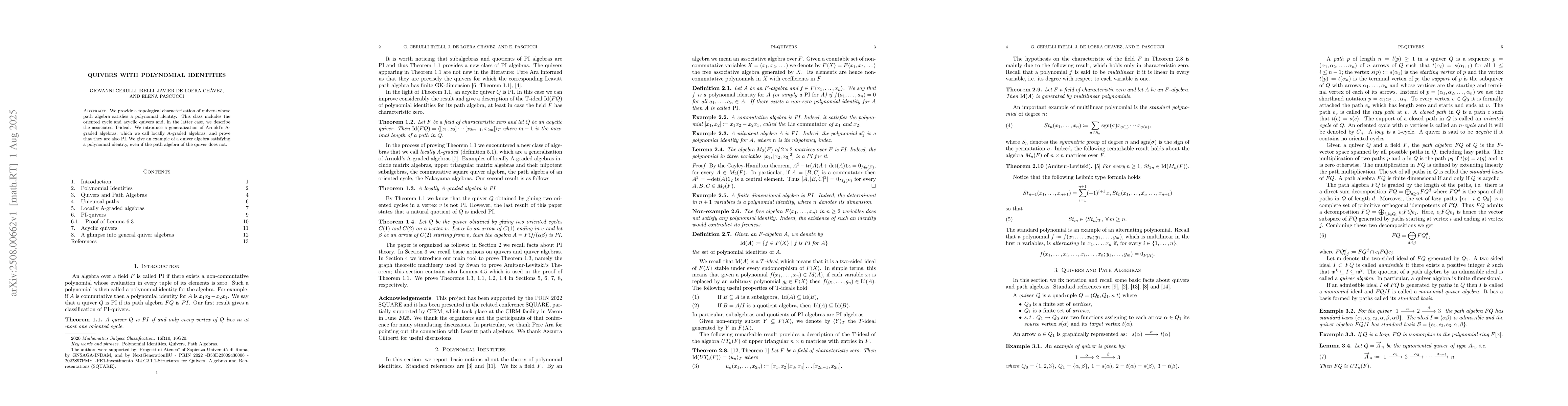 This paper characterizes quivers with path algebras satisfying polynomial identities, including cyclic and acyclic quivers. It introduces locally A-graded algebras, a generalization of Arnold's A-graded algebras, proving they are PI. An example is provided of a quiver algebra adhering to a polynomial identity, despite its path algebra not doing so.