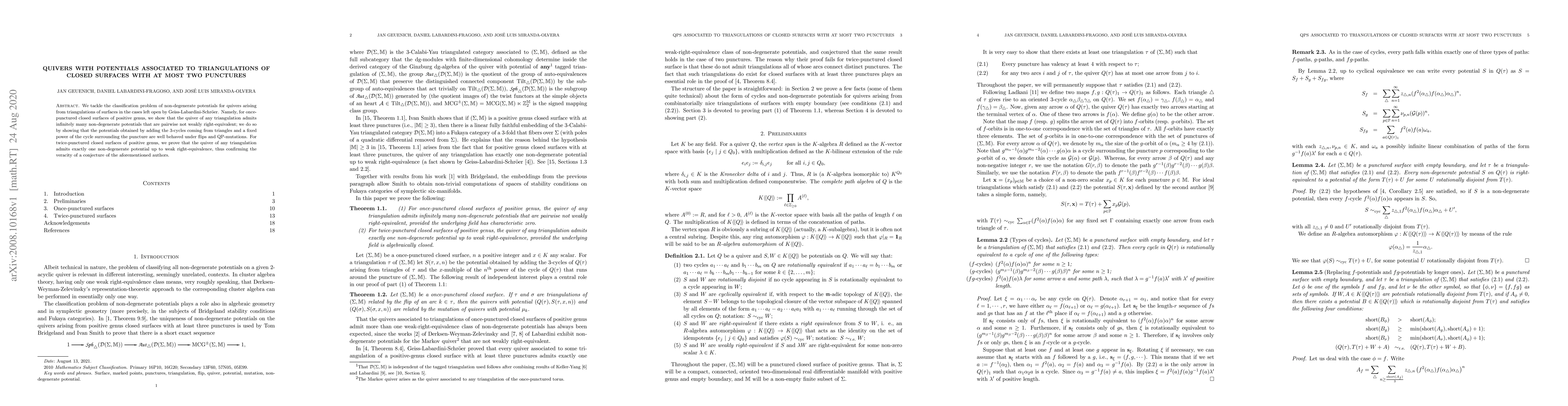 This paper classifies non-degenerate potentials for quivers from triangulations of closed surfaces with up to two punctures. For once-punctured surfaces, it demonstrates an infinite variety of non-degenerate potentials, while for twice-punctured surfaces, it confirms the existence of exactly one such potential, validating a conjecture.