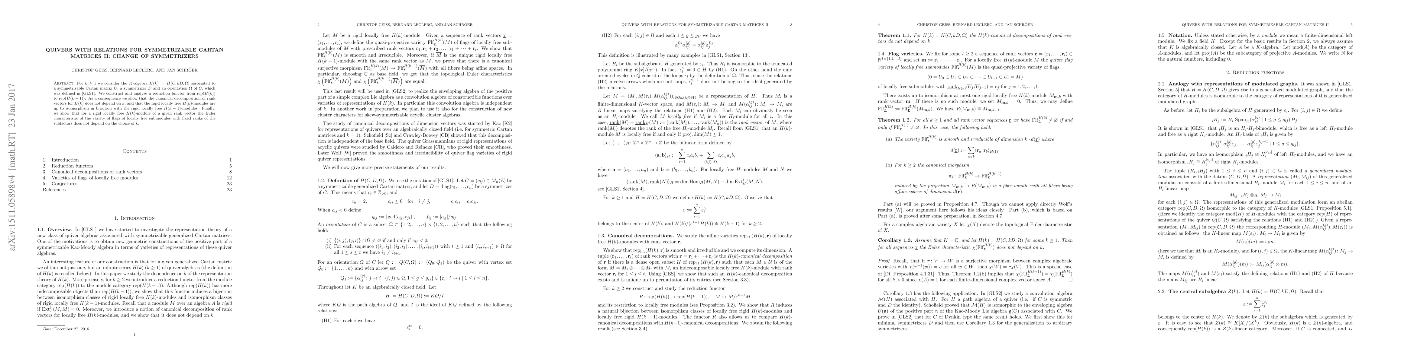 This paper constructs a reduction functor from the representation category of $H(k)$ to $H(k-1)$ for symmetrizable Cartan matrices. It demonstrates that the canonical decomposition of rank vectors and the Euler characteristic of certain module varieties are invariant under this reduction.