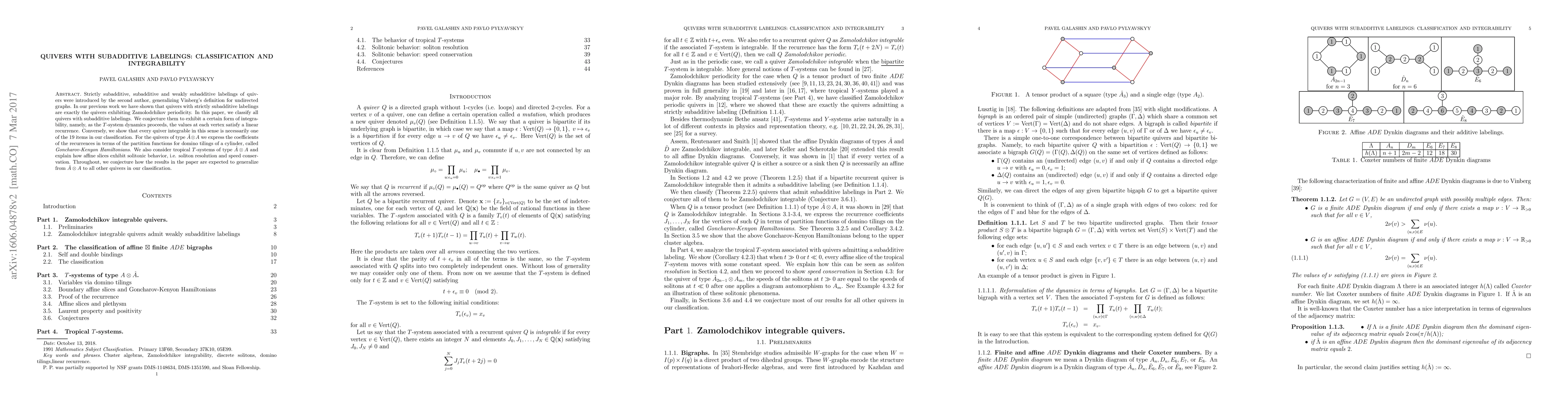 Strictly subadditive, subadditive and weakly subadditive labelings of quivers were introduced by the second author, generalizing Vinberg's definition for undirected graphs. In our previous work we have shown that quivers with strictly subadditive labelings are exactly the quivers exhibiting Zamolodchikov periodicity. In this paper, we classify all quivers with subadditive labelings. We conjecture them to exhibit a certain form of integrability, namely, as the $T$-system dynamics proceeds, the values at each vertex satisfy a linear recurrence. Conversely, we show that every quiver integrable in this sense is necessarily one of the $19$ items in our classification. For the quivers of type $\hat A \otimes A$ we express the coefficients of the recurrences in terms of the partition functions for domino tilings of a cylinder, called \emph{Goncharov-Kenyon Hamiltonians}. We also consider tropical $T$-systems of type $\hat A \otimes A$ and explain how affine slices exhibit solitonic behavior, i.e. soliton resolution and speed conservation. Throughout, we conjecture how the results in the paper are expected to generalize from $\hat A \otimes A$ to all other quivers in our classification.