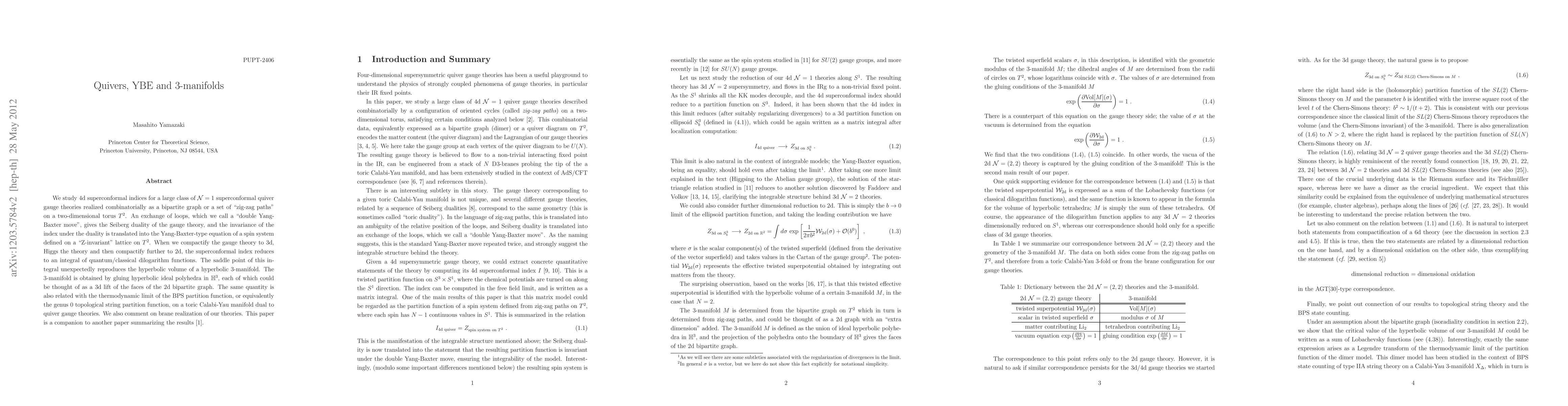 We study 4d superconformal indices for a large class of N=1 superconformal quiver gauge theories realized combinatorially as a bipartite graph or a set of "zig-zag paths" on a two-dimensional torus T^2. An exchange of loops, which we call a "double Yang-Baxter move", gives the Seiberg duality of the gauge theory, and the invariance of the index under the duality is translated into the Yang-Baxter-type equation of a spin system defined on a "Z-invariant" lattice on T^2. When we compactify the gauge theory to 3d, Higgs the theory and then compactify further to 2d, the superconformal index reduces to an integral of quantum/classical dilogarithm functions. The saddle point of this integral unexpectedly reproduces the hyperbolic volume of a hyperbolic 3-manifold. The 3-manifold is obtained by gluing hyperbolic ideal polyhedra in H^3, each of which could be thought of as a 3d lift of the faces of the 2d bipartite graph.The same quantity is also related with the thermodynamic limit of the BPS partition function, or equivalently the genus 0 topological string partition function, on a toric Calabi-Yau manifold dual to quiver gauge theories. We also comment on brane realization of our theories. This paper is a companion to another paper summarizing the results.