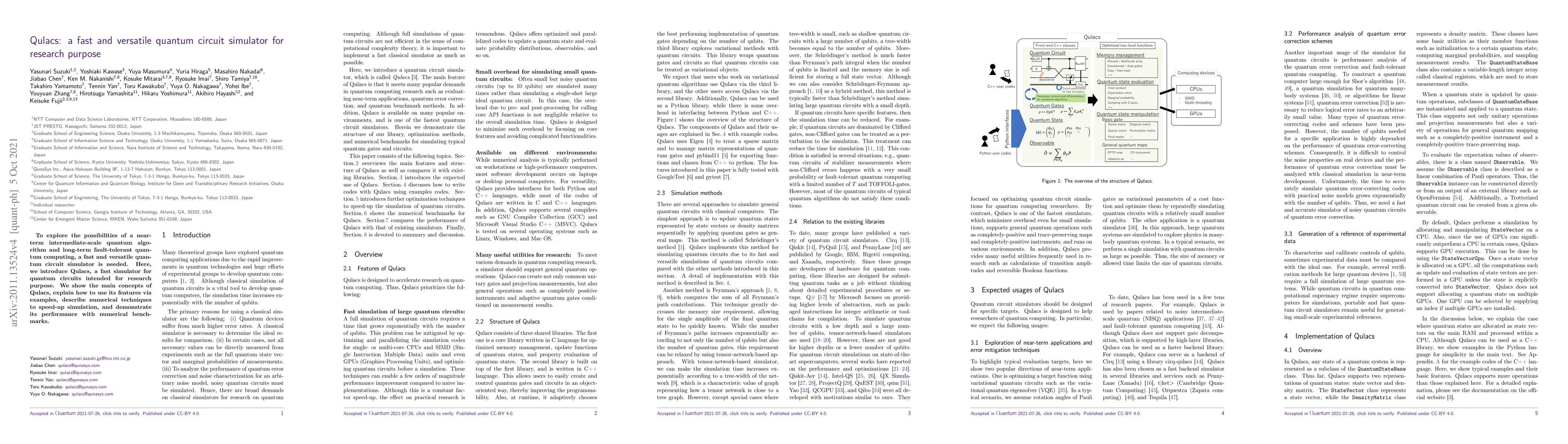 Qulacs is a high-performance quantum circuit simulator designed for both near-term and long-term quantum computing research. It offers advanced features and numerical techniques to accelerate simulations, as demonstrated through benchmarks.