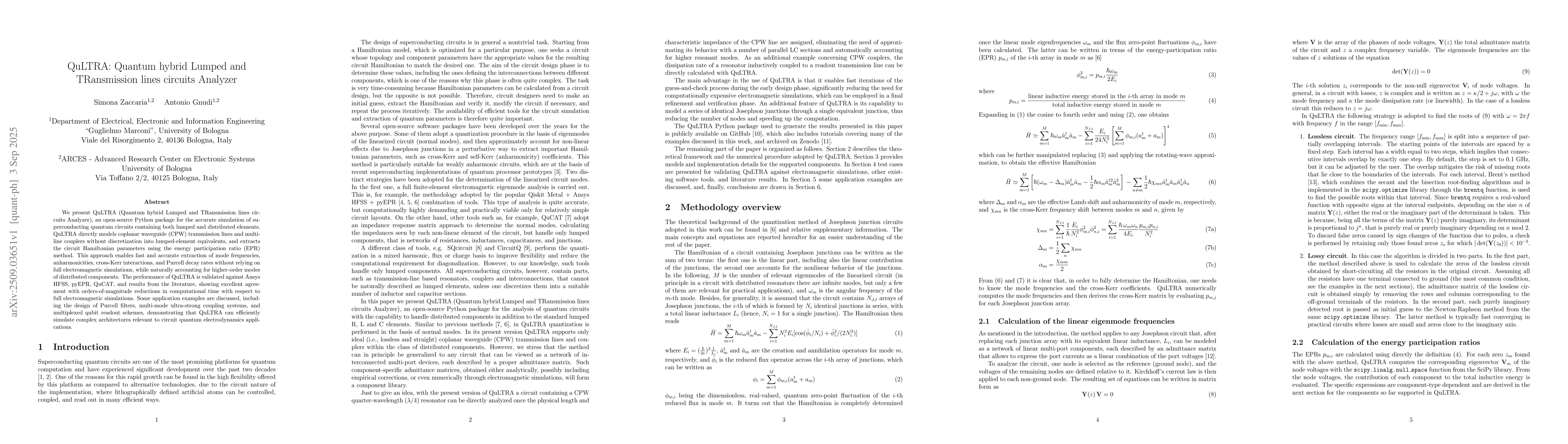 We present QuLTRA (Quantum hybrid Lumped and TRansmission lines circuits Analyzer), an open-source Python package for the accurate simulation of superconducting quantum circuits containing both lumped and distributed elements. QuLTRA directly models coplanar waveguide (CPW) transmission lines and multi-line couplers without discretization into lumped-element equivalents, and extracts the circuit Hamiltonian parameters using the energy participation ratio (EPR) method. This approach enables fast and accurate extraction of mode frequencies, anharmonicities, cross-Kerr interactions, and Purcell decay rates without relying on full electromagnetic simulations, while naturally accounting for higher-order modes of distributed components. The performance of QuLTRA is validated against Ansys HFSS, pyEPR, QuCAT, and results from the literature, showing excellent agreement with orders-of-magnitude reductions in computational time with respect to full electromagnetic simulations. Some application examples are discussed, including the design of Purcell filters, multi-mode ultra-strong coupling systems, and multiplexed qubit readout schemes, demonstrating that QuLTRA can efficiently simulate complex architectures relevant to circuit quantum electrodynamics applications.