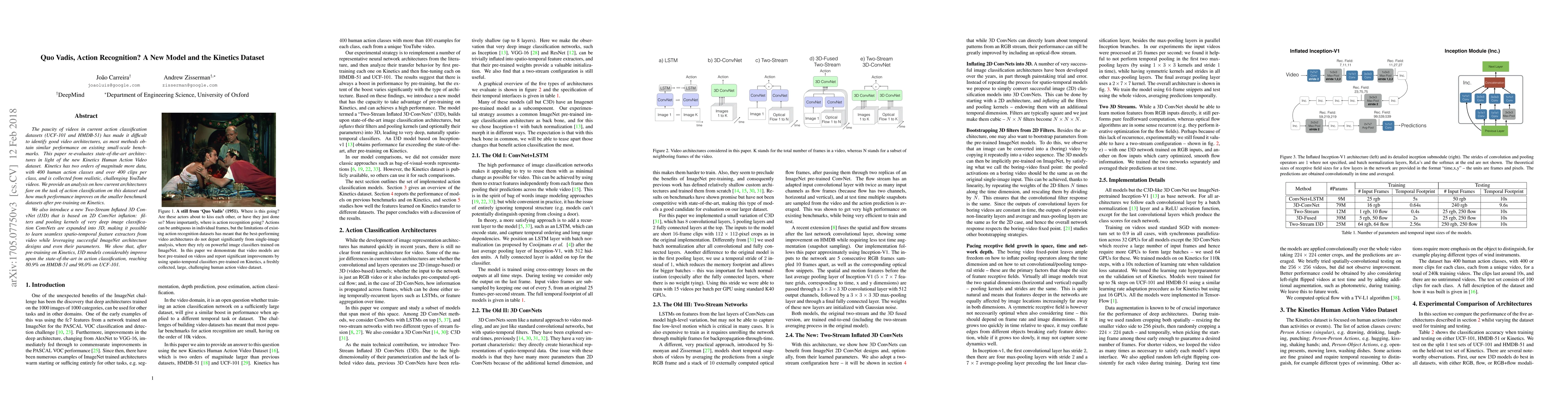 The paucity of videos in current action classification datasets (UCF-101 and HMDB-51) has made it difficult to identify good video architectures, as most methods obtain similar performance on existing small-scale benchmarks. This paper re-evaluates state-of-the-art architectures in light of the new Kinetics Human Action Video dataset. Kinetics has two orders of magnitude more data, with 400 human action classes and over 400 clips per class, and is collected from realistic, challenging YouTube videos. We provide an analysis on how current architectures fare on the task of action classification on this dataset and how much performance improves on the smaller benchmark datasets after pre-training on Kinetics. We also introduce a new Two-Stream Inflated 3D ConvNet (I3D) that is based on 2D ConvNet inflation: filters and pooling kernels of very deep image classification ConvNets are expanded into 3D, making it possible to learn seamless spatio-temporal feature extractors from video while leveraging successful ImageNet architecture designs and even their parameters. We show that, after pre-training on Kinetics, I3D models considerably improve upon the state-of-the-art in action classification, reaching 80.9% on HMDB-51 and 98.0% on UCF-101.