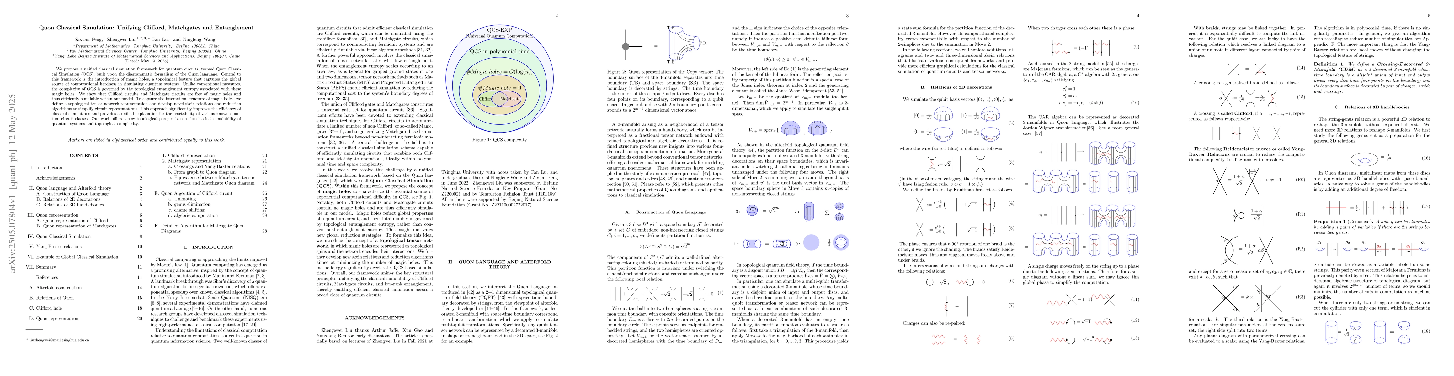 The research introduces Quon Classical Simulation (QCS), a unified framework for simulating quantum circuits using topological features called magic holes. QCS simplifies circuit representations via tensor networks and skein relations, showing Clifford and Matchgate circuits are efficiently simulable. This offers a topological perspective on classical simulation of quantum systems.