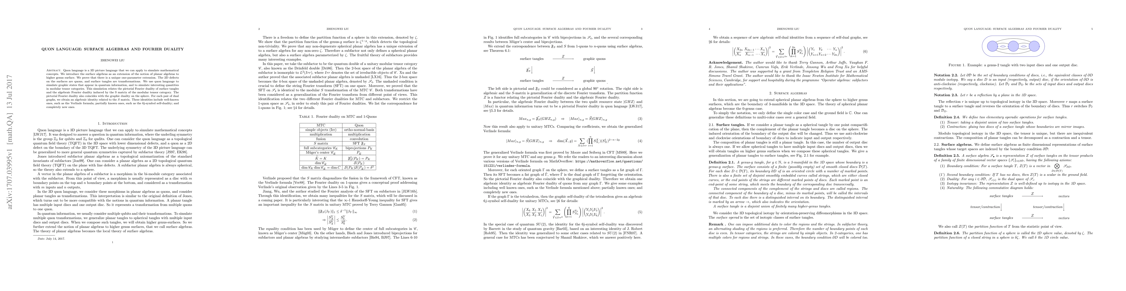 This paper introduces the quon language to simulate mathematical concepts using 3D picture language, extending planar algebras to surface algebras. It establishes a unique one-parameter extension and connects pictorial Fourier duality of surface tangles to algebraic Fourier duality via the S matrix in modular tensor categories, revealing new algebraic identities including the Verlinde formula.