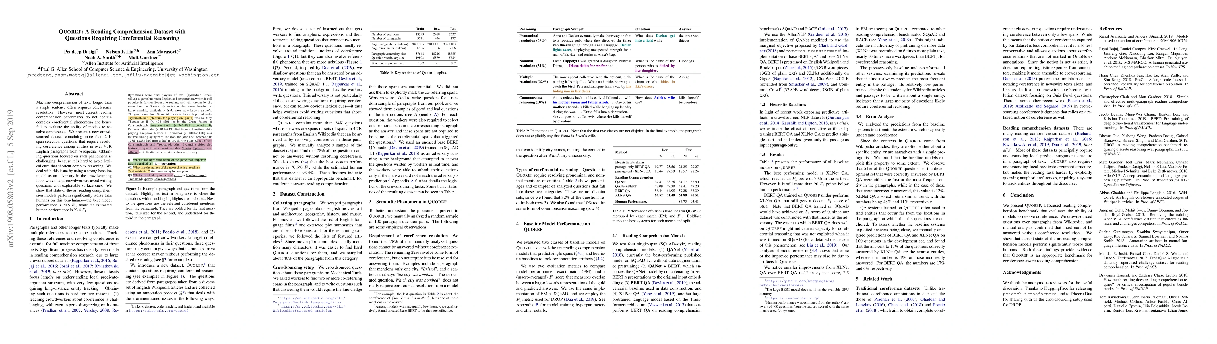 Title: Quoref: A Reading Comprehension Dataset with Questions Requiring Coreferential Reasoning Summary: This paper introduces Quoref, a new dataset for evaluating models' ability to resolve coreference in long texts, featuring over 24K questions from Wikipedia. The dataset addresses the challenge of avoiding lexical cues by using a baseline model to guide crowdworkers, revealing a significant gap between human and current model performance.